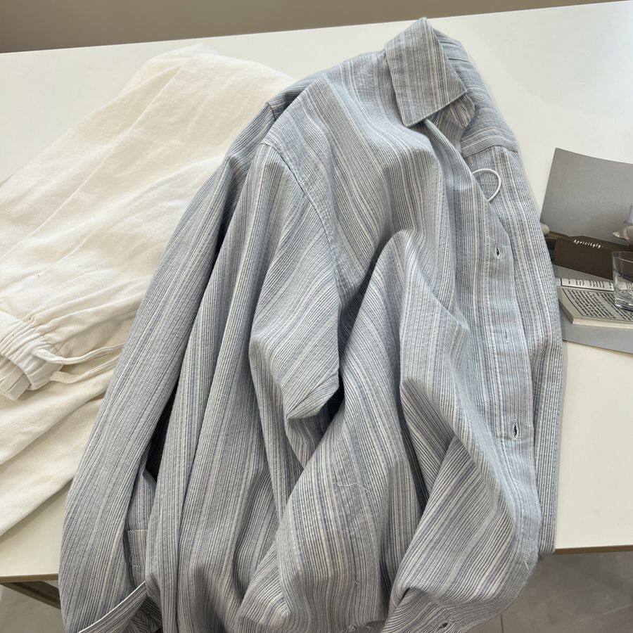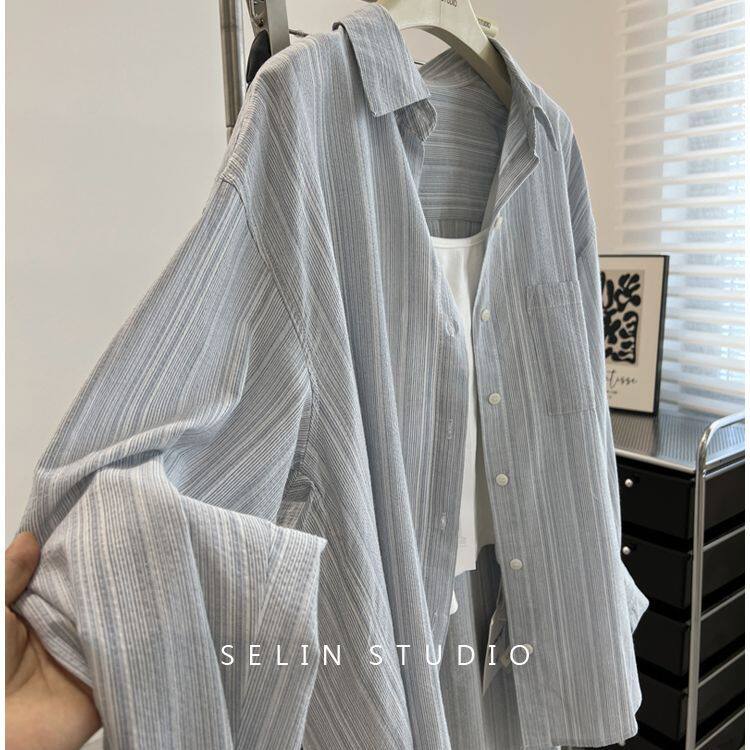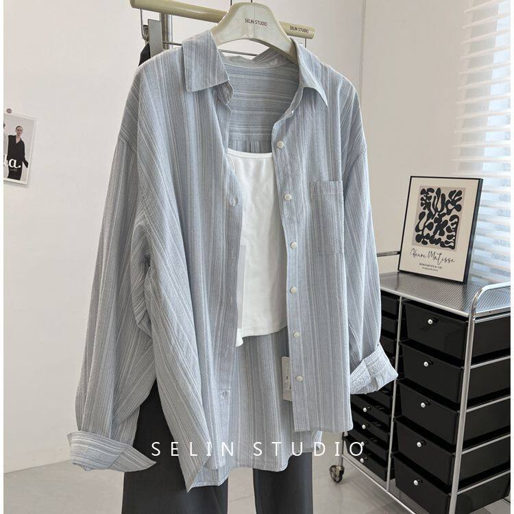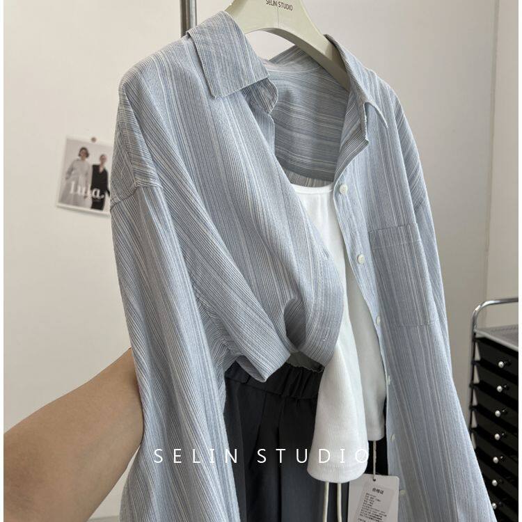 📚 棉麻条纹新款衬衫设计薄款蓝色宽松上衣防晒夏季衬衣休闲外套百搭