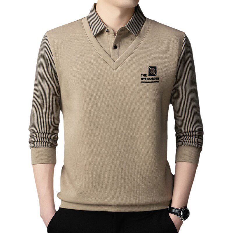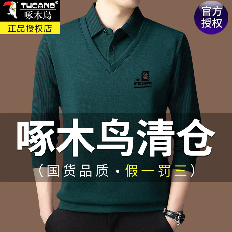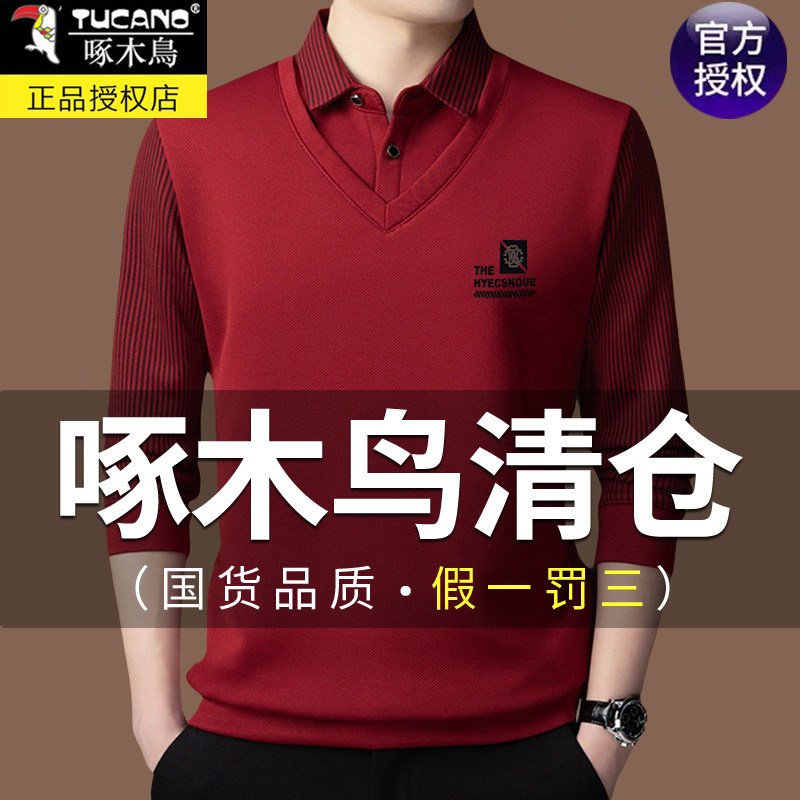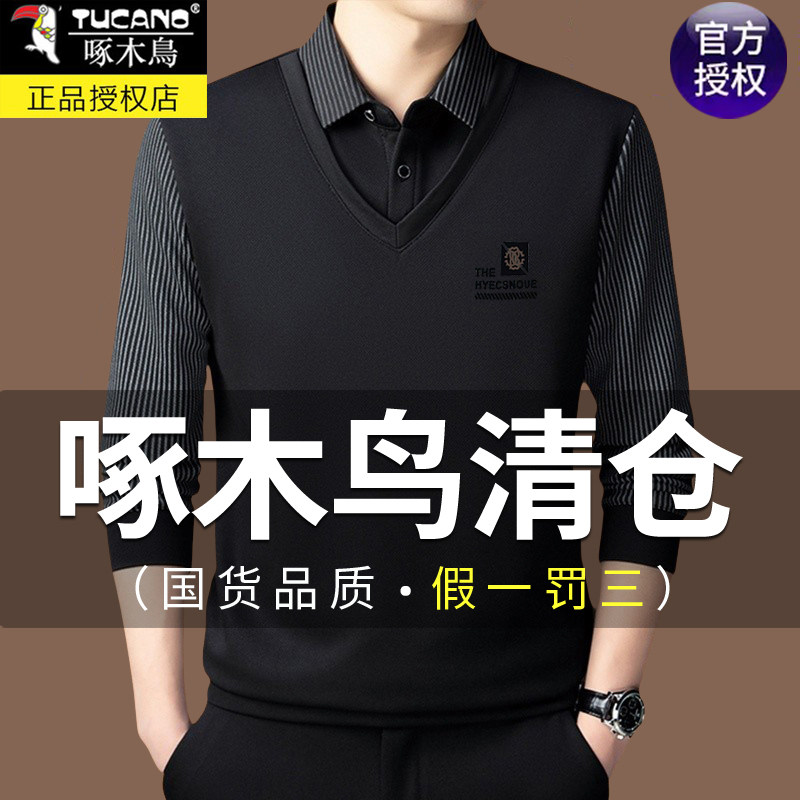 📚 啄木鸟高档男士中年假两件条纹衬衫领冬季款加绒加厚保暖爸爸上衣