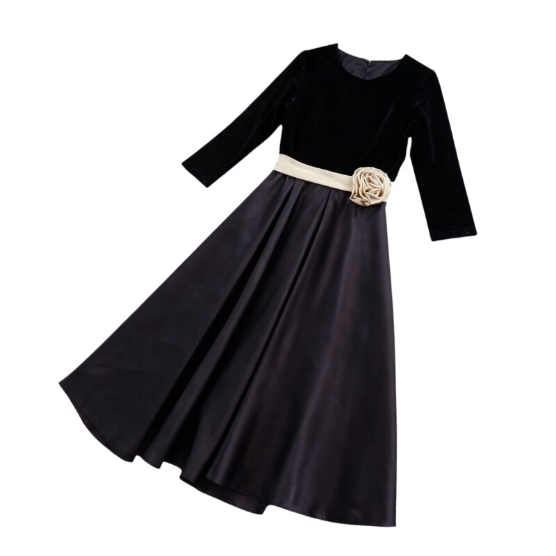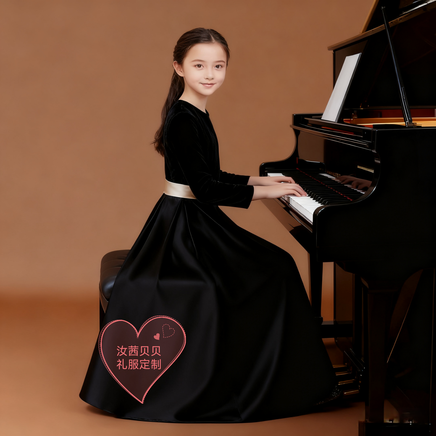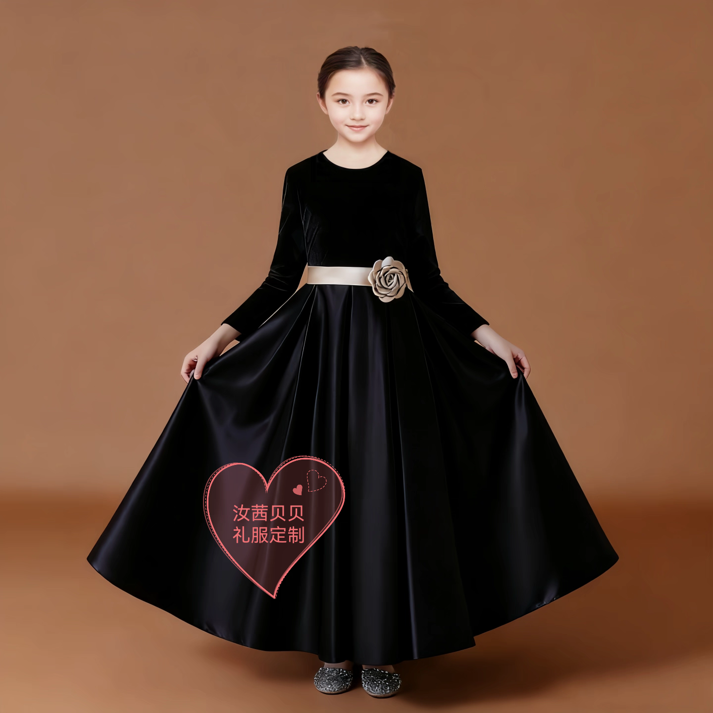 📚 大码晚礼服女大童黑色丝绒长袖小提琴演奏生日宴会走秀钢琴演出服