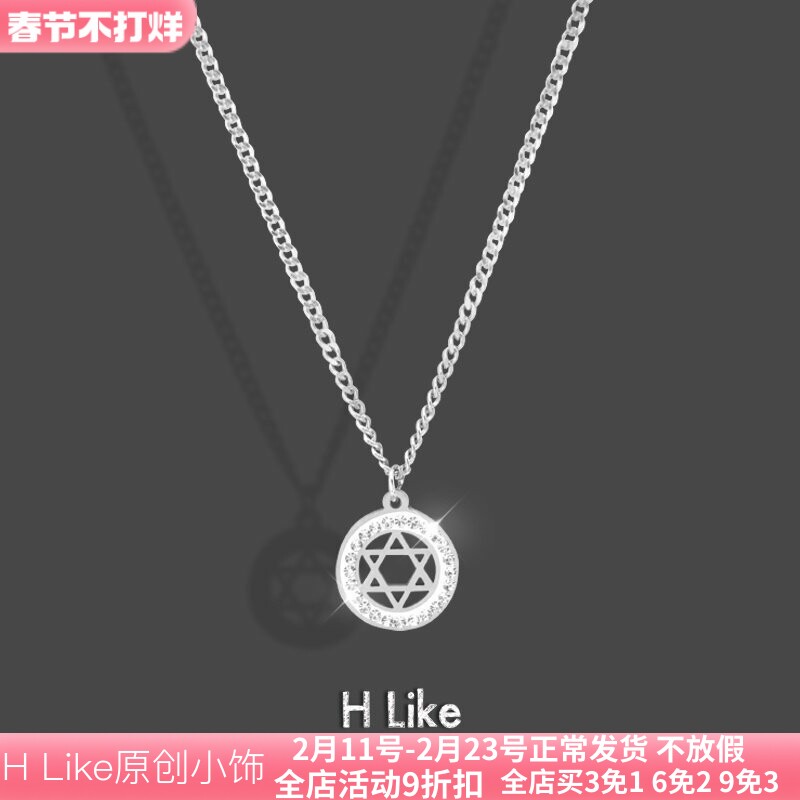 📚 圆牌轻奢水钻六芒星项链吊坠饰品复古欧美钛钢不掉色潮酷情侣男女