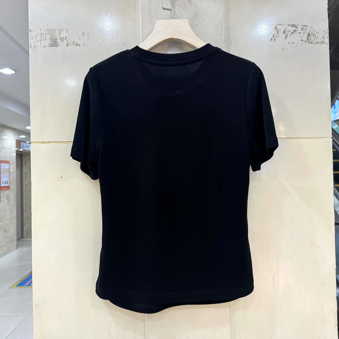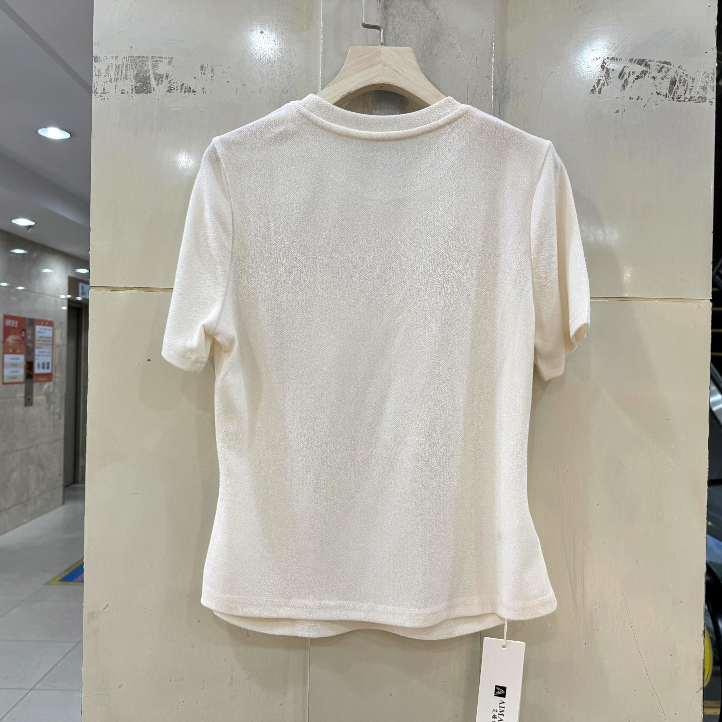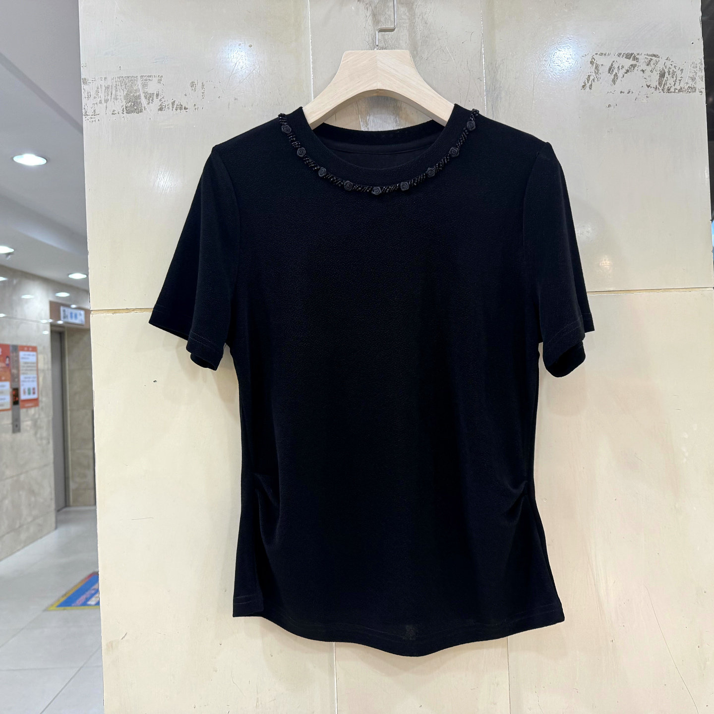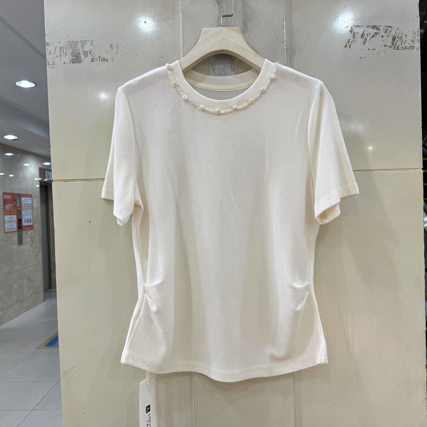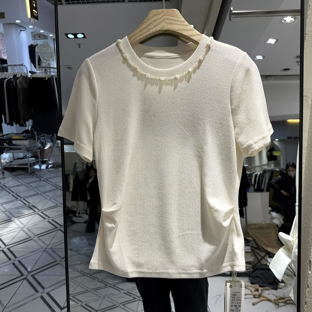 📚 艾嫚伊A5559 重工钉珠圆领短袖皱褶修身弹力醋酸T恤小衫上衣春夏
