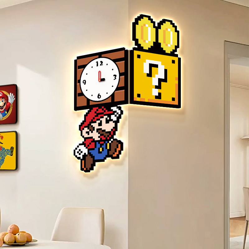 📚 创意马里奥双面转角时钟挂画客厅儿童卧室拐角钟表墙壁装饰画带灯