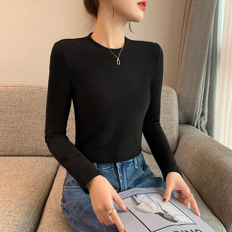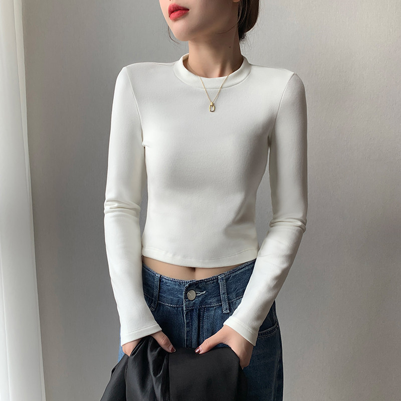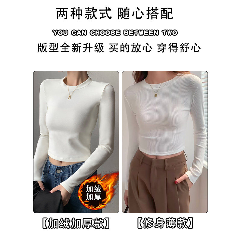 📚 圆领加绒加厚打底衫女2026新款秋冬内搭短款露脐修身显瘦长袖上衣