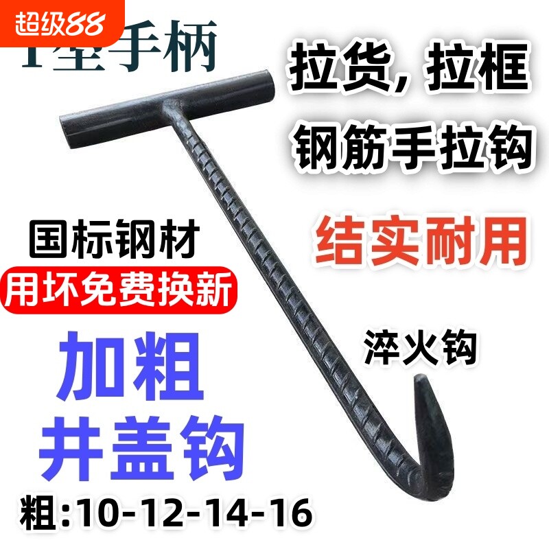 📚 T型井盖钩子起下水道盖勾开工窨井盖钩菜篮子拉货钢筋螺纹钢锻打