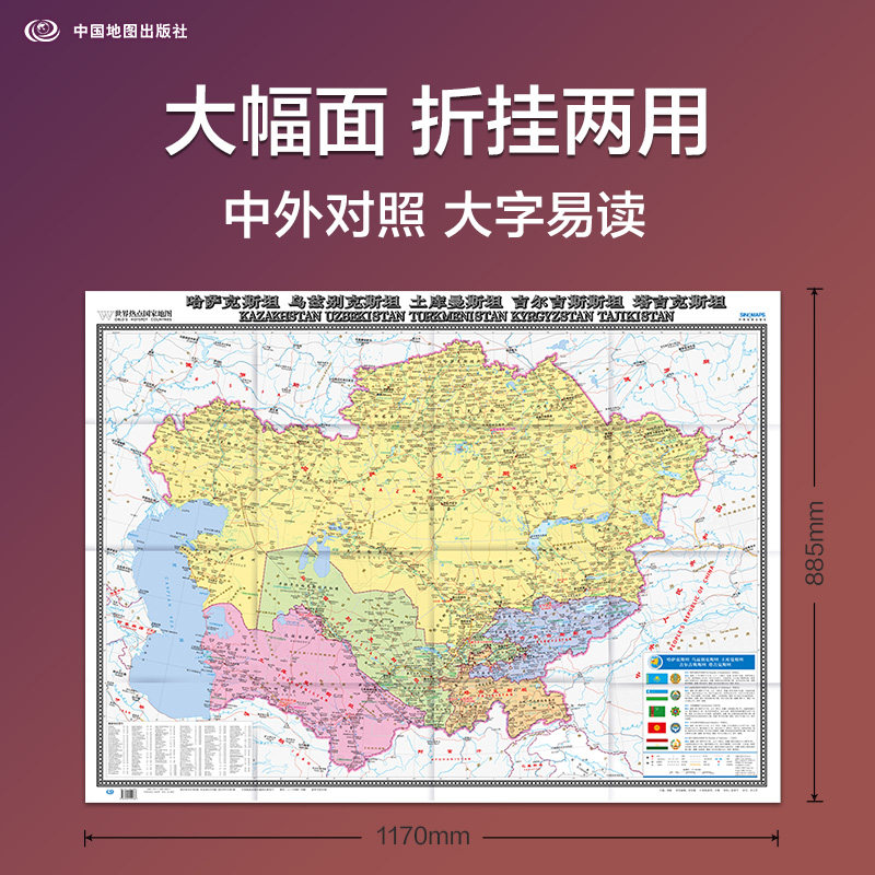 📚 2025中亚五国地图哈萨克斯坦乌兹别克塔吉克土库曼吉尔吉斯斯坦 中外文对照 大字版 折挂两用、865mm×1170mm大全开地图