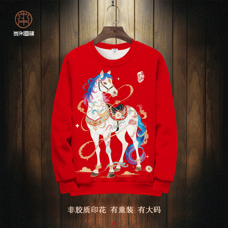📚 红色本命年卫衣外套男马年生肖印花圆领长袖T恤oversize加绒上衣