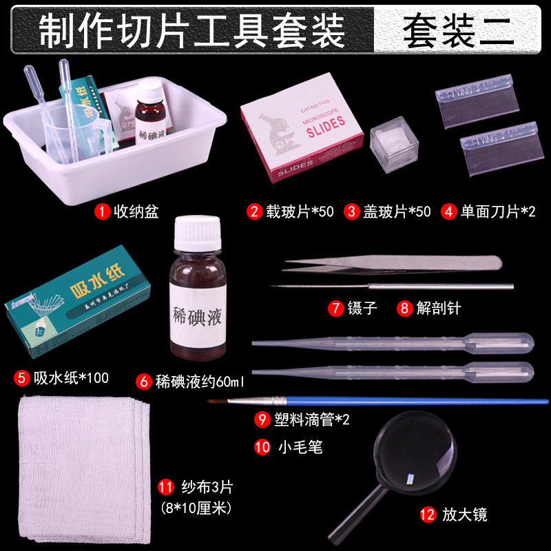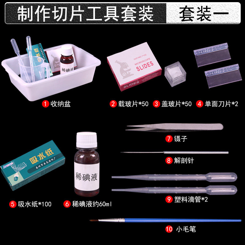 📚 生物临时装片制作工具套装稀碘液切片染色用洋葱内表皮吸水纸载玻片盖玻片解剖剪镊子刀片纱布10*10小木板块