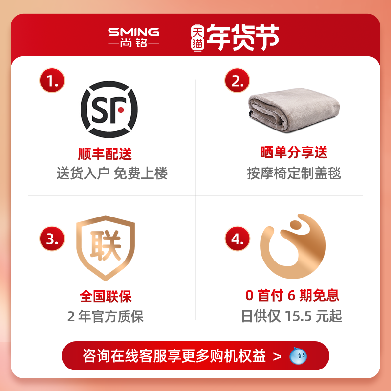 08¥ HU287 GrHYULlPTWV¥ https://m.tb.cn/h.7Byh6PQ 尚铭按摩椅家用全身AI智能语音豪华小型多功能全自动太空老人826L --------------------- 【原售价】8,400元 【优惠券】3,848元 【券后价】4,552元。