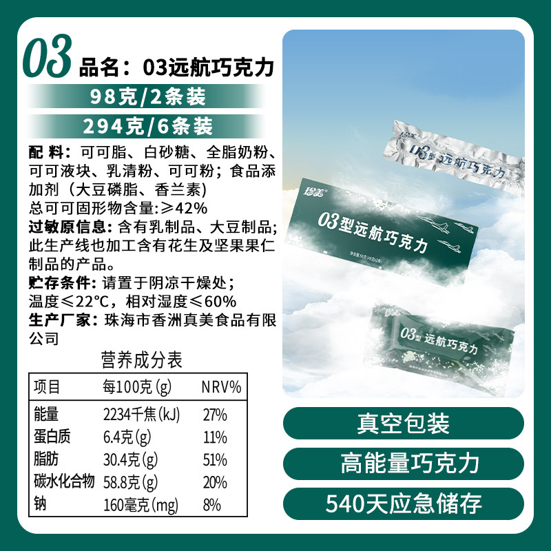 📚 珍美03型远航巧克力纯可可脂空勤厂家直供补充14天户外应急食品