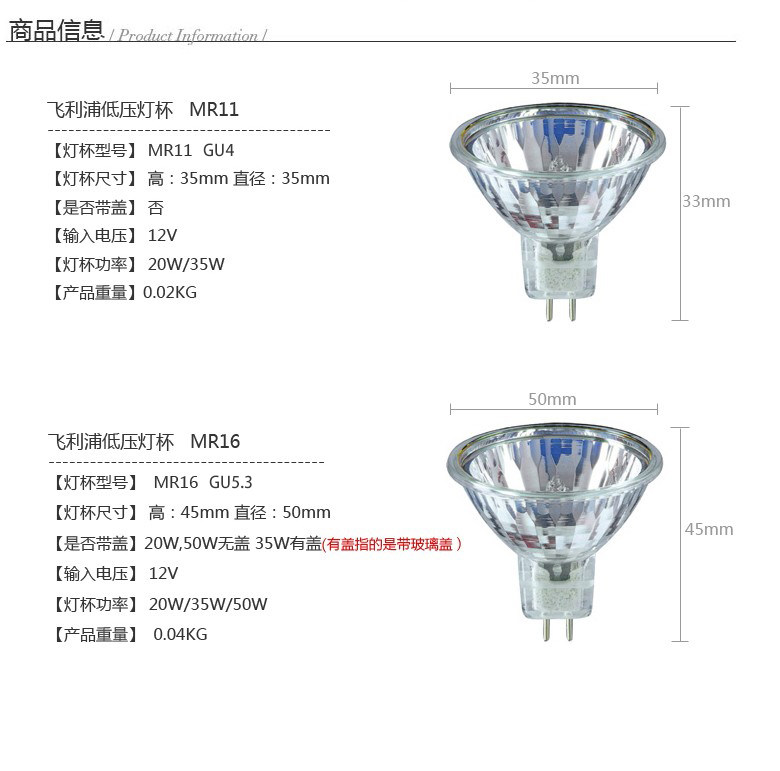 📚 飞利浦卤素灯杯12V低压20W35W50W卤钨射灯MR16插脚灯泡MR11