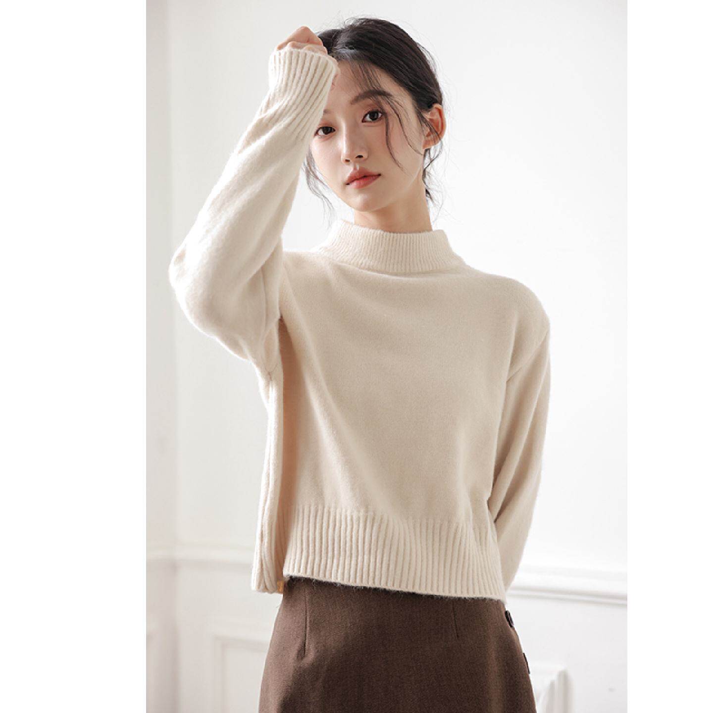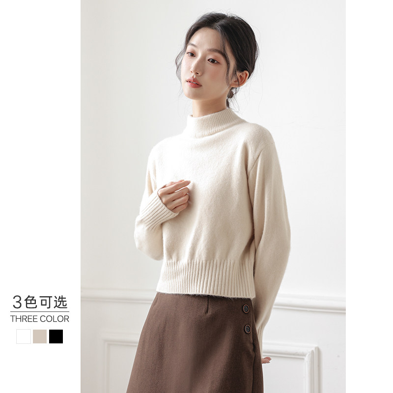 📚 半高领短款毛衣女秋冬加厚高级感打底内搭中领长袖白色针织衫上衣