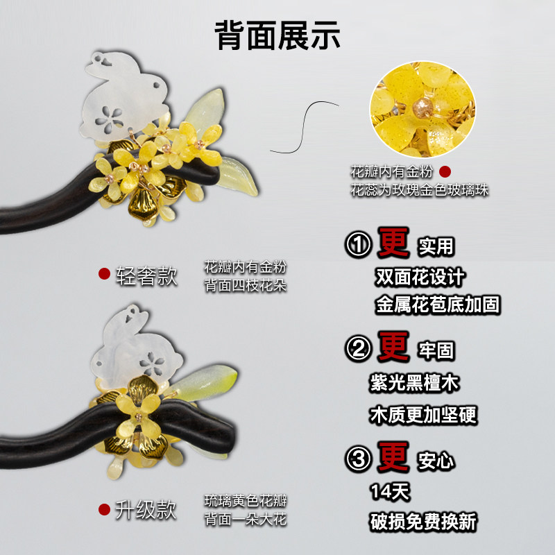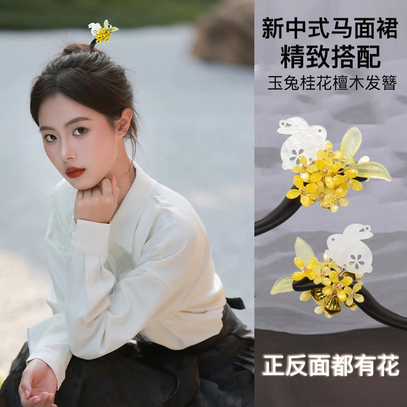 📚 赵丽颖玉兔桂花发簪新中式古风檀木簪子女马面裙头饰盘发发钗发饰