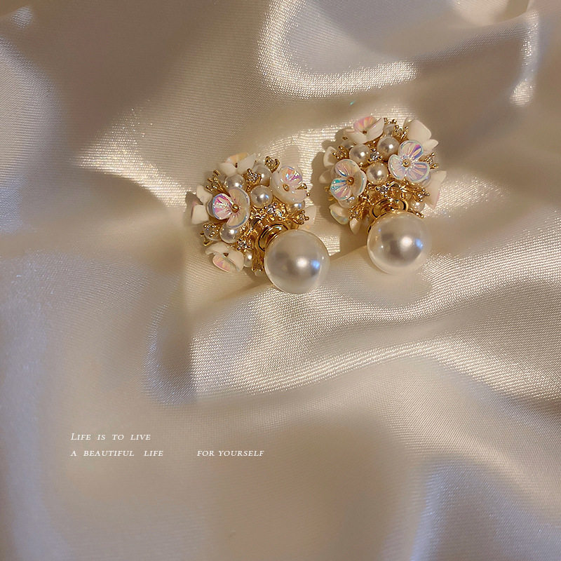 📚 925银针锆石珍珠花朵耳环法式复古贝壳球状耳钉超仙气质百搭耳饰