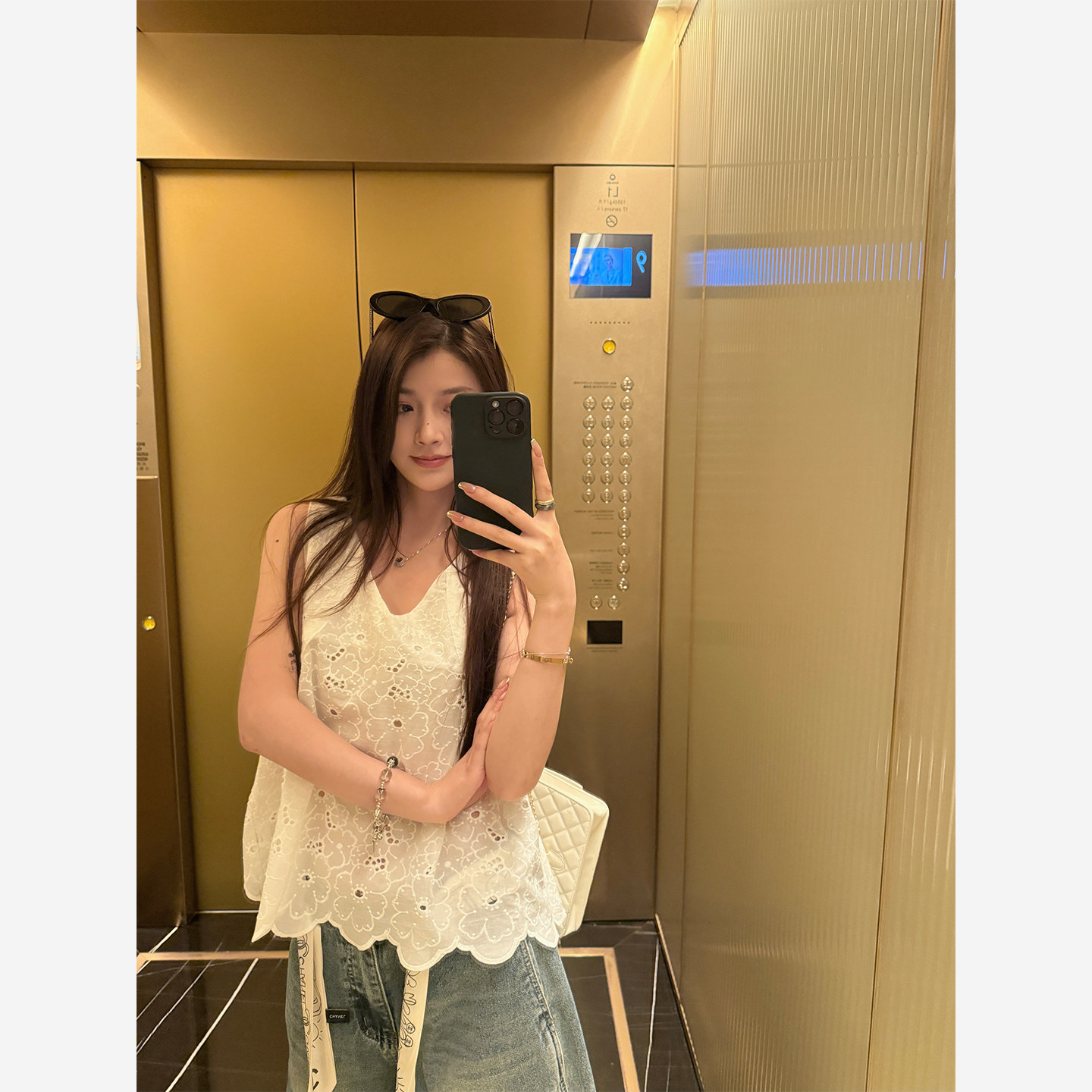 📚 Here yaya shop 6.7 20:00 甜心奶油清冷感白色v领蕾丝钩花背心女