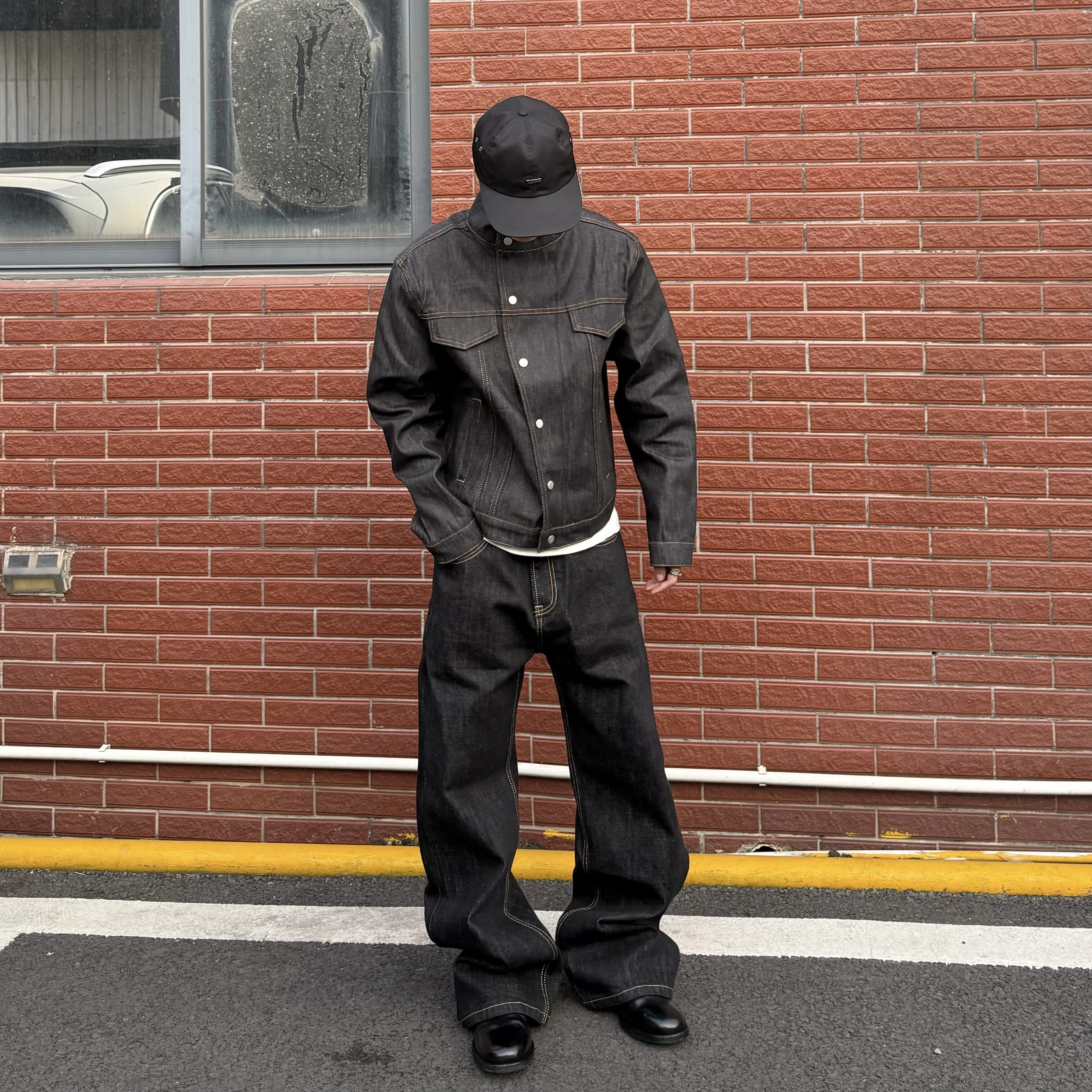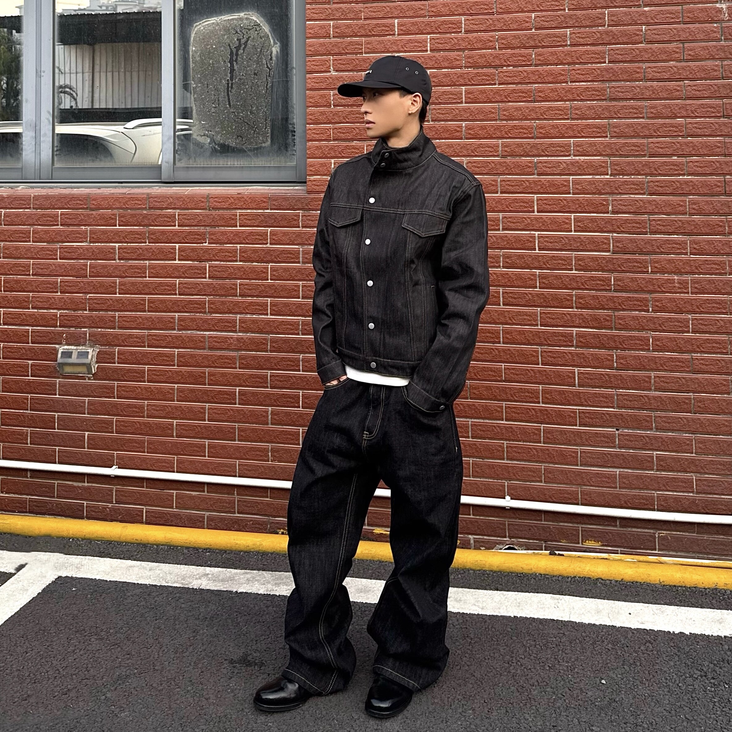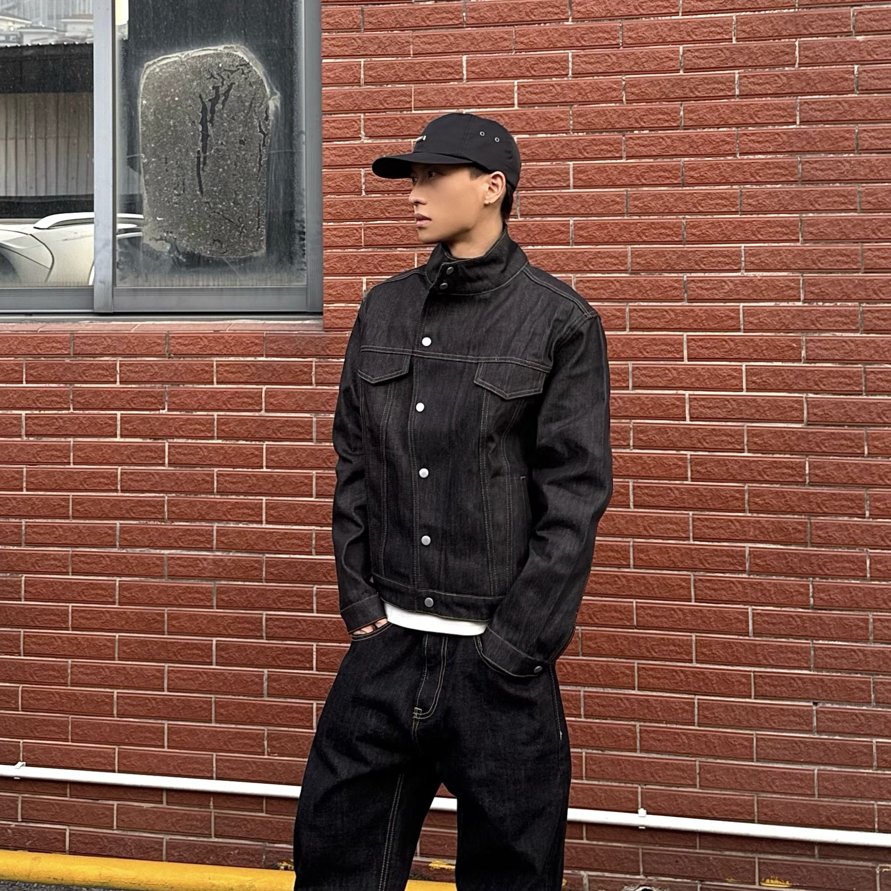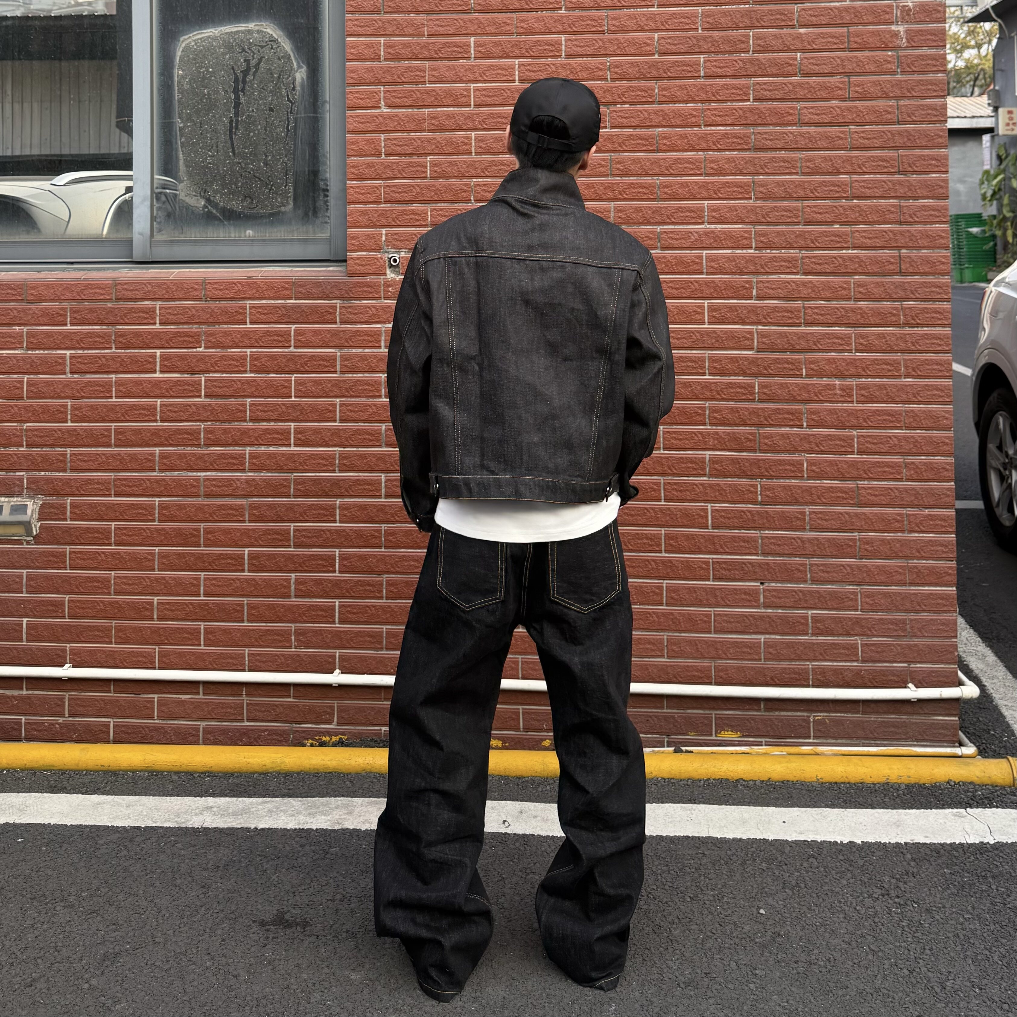 📚 HY711 斜襟立领剪裁廓形短宽黑色原牛夹克男女美式硬挺牛仔外套