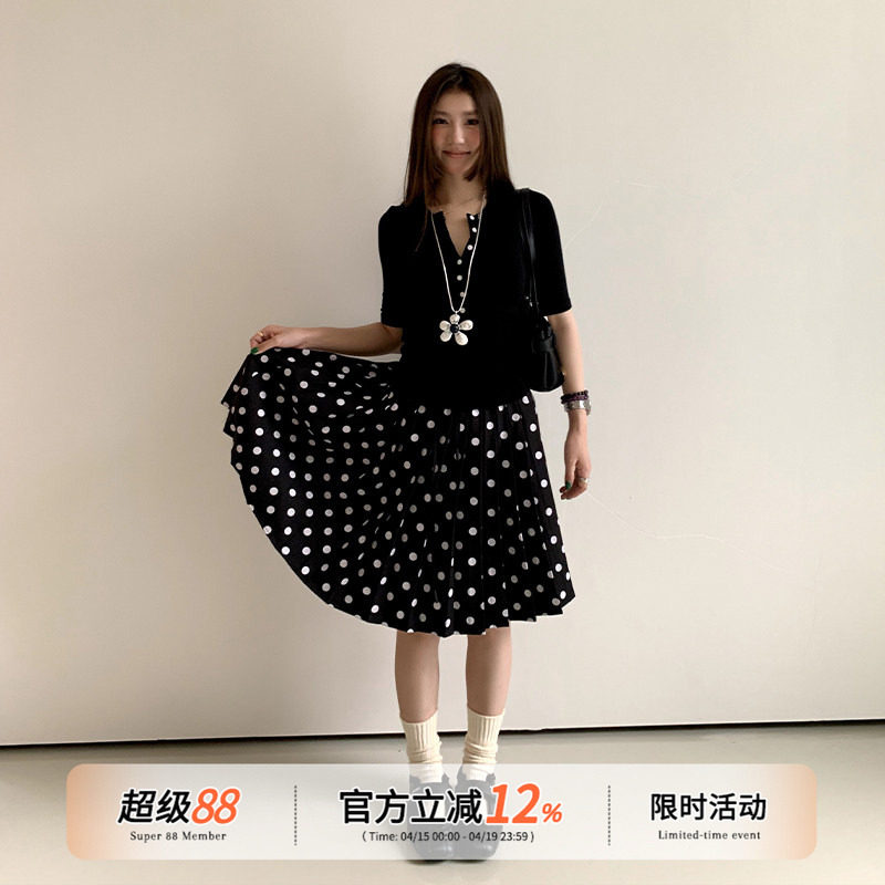 📚 橘子树在哪儿复古波点百褶半身裙女夏季高腰宽松显瘦气质百搭中裙