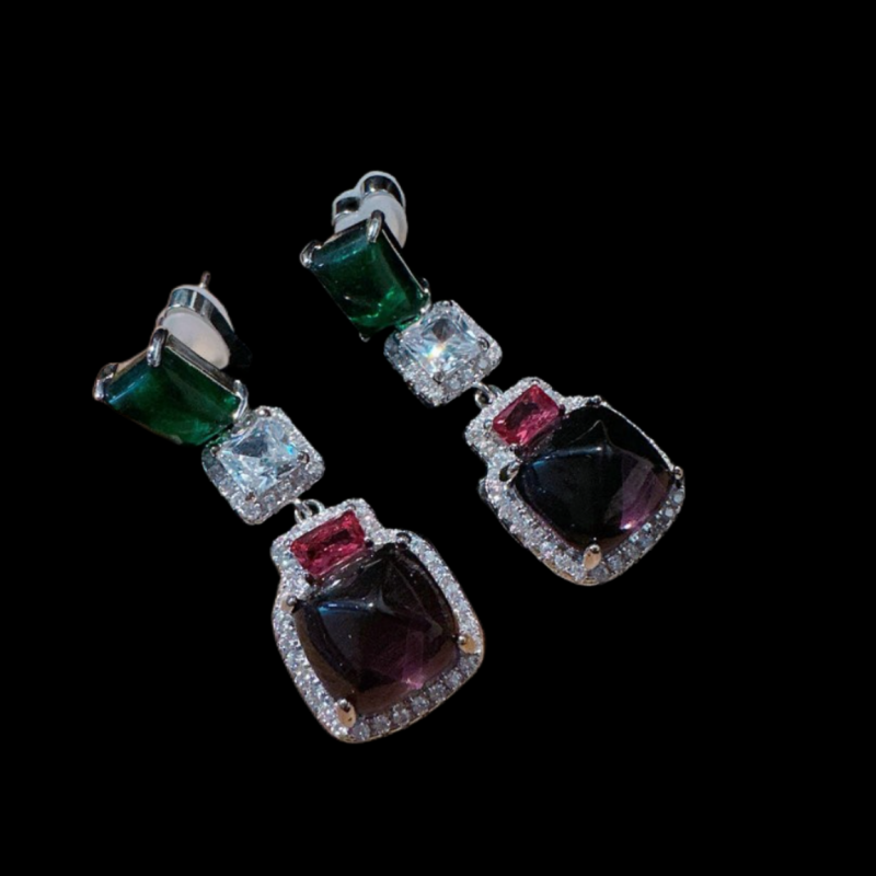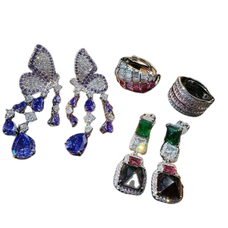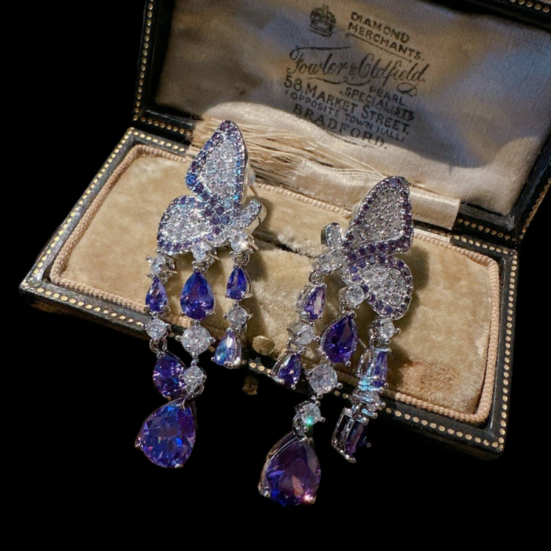 📚 鸢尾紫霜花蝴蝶宝石耳坠古董感镀18K金 胭脂粉渐变锆石戒指叠戴