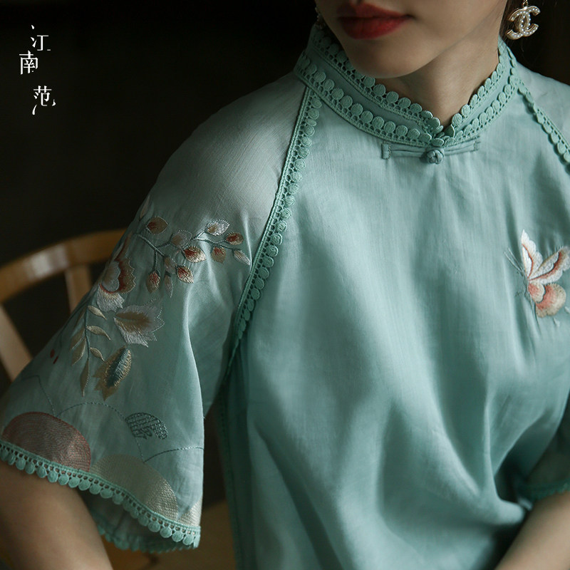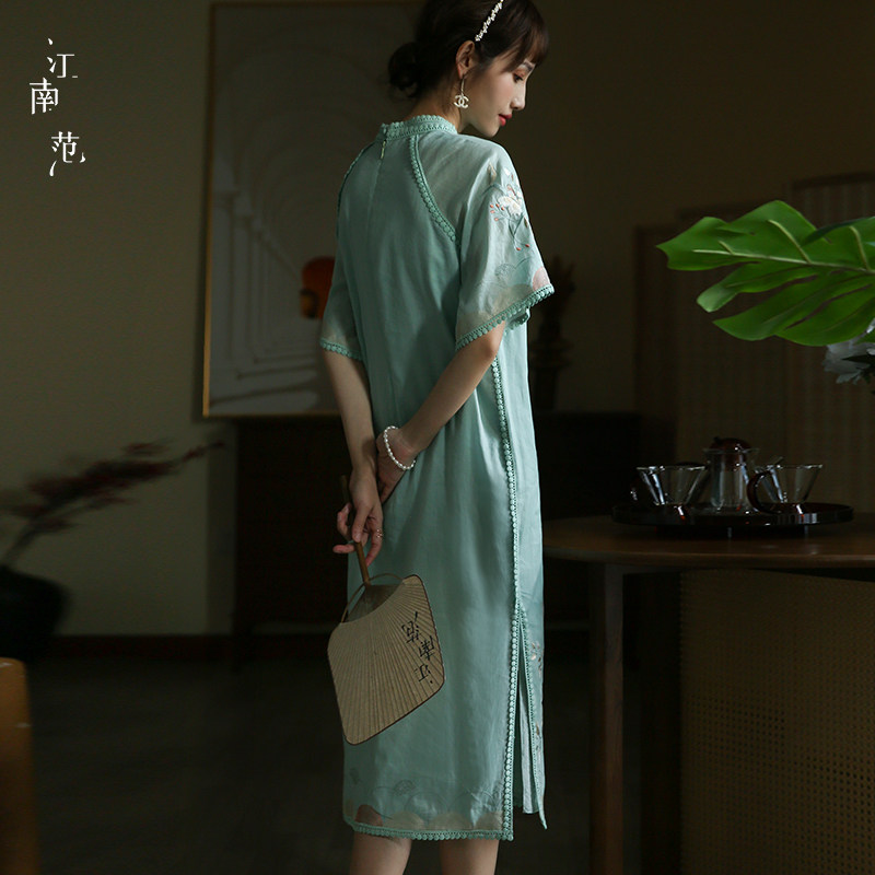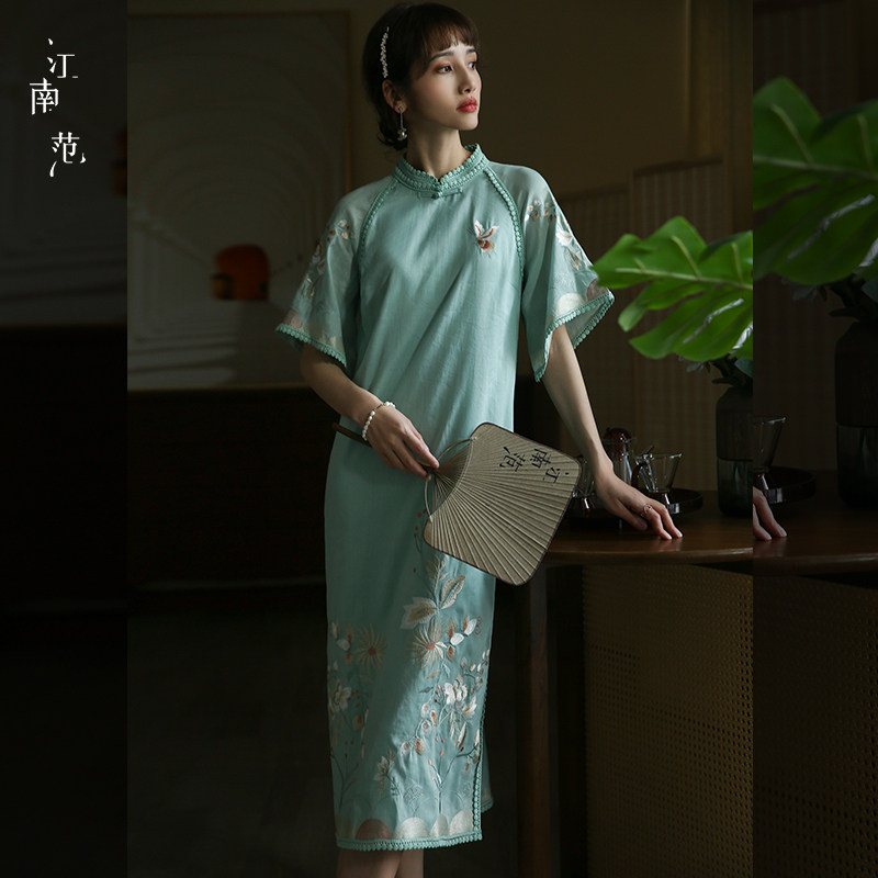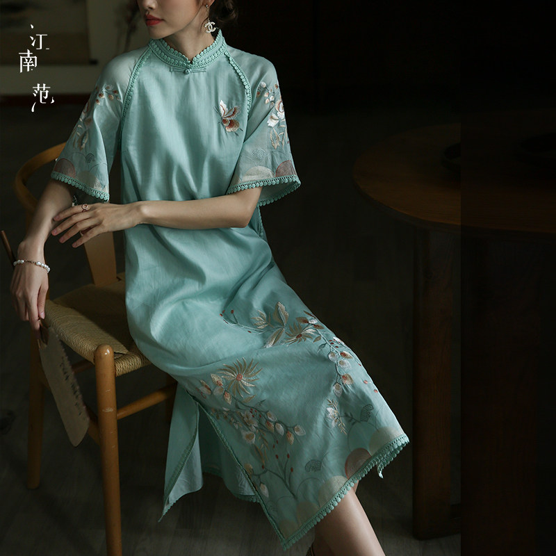 📚 江南范新式刺绣改良版低领旗袍年轻款清新淡雅日常上班穿苎麻裙子