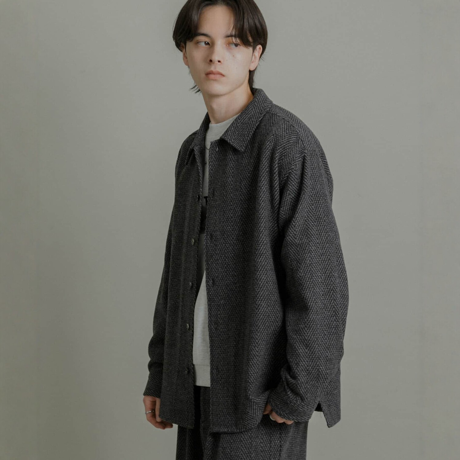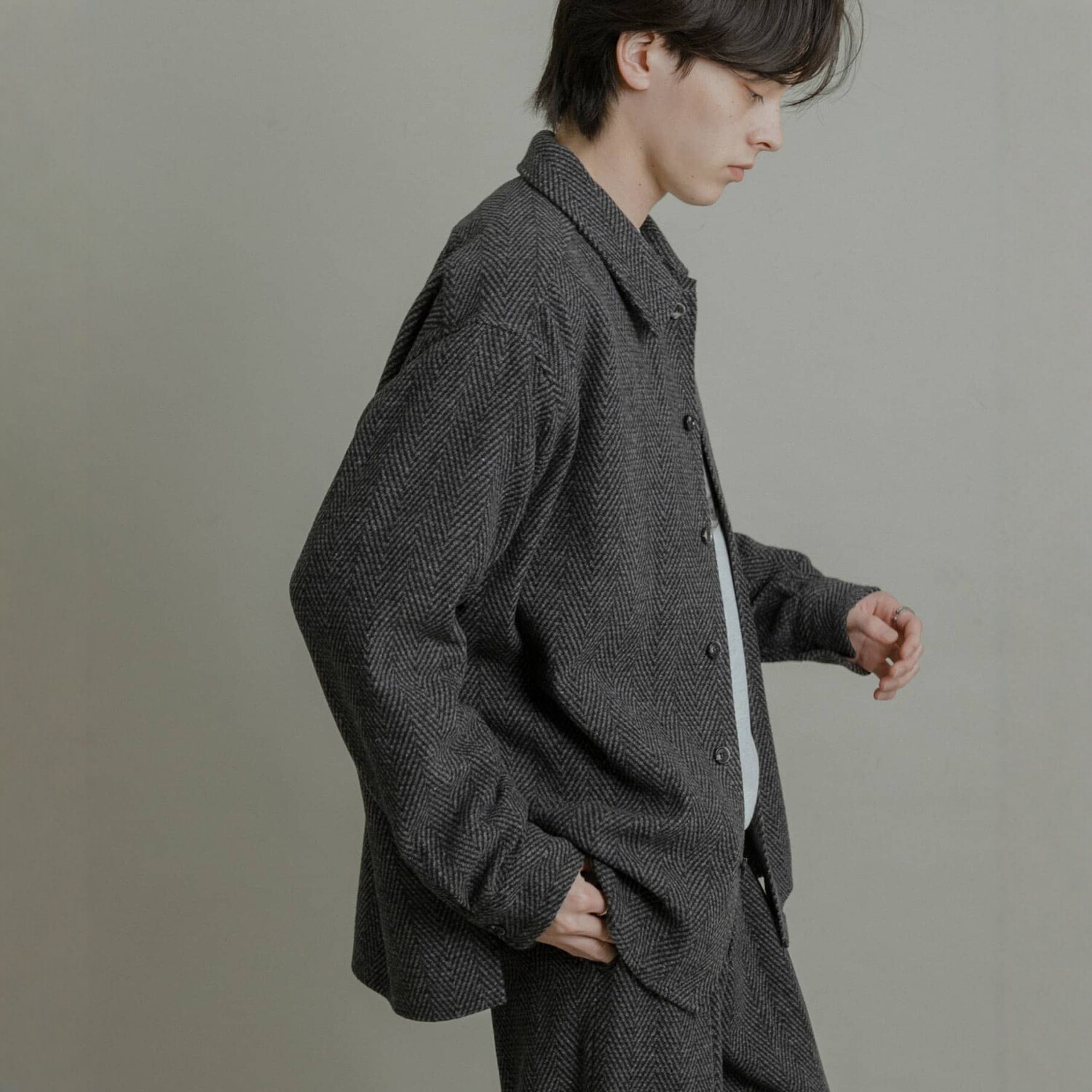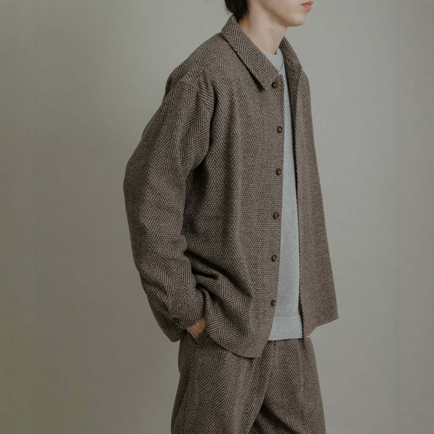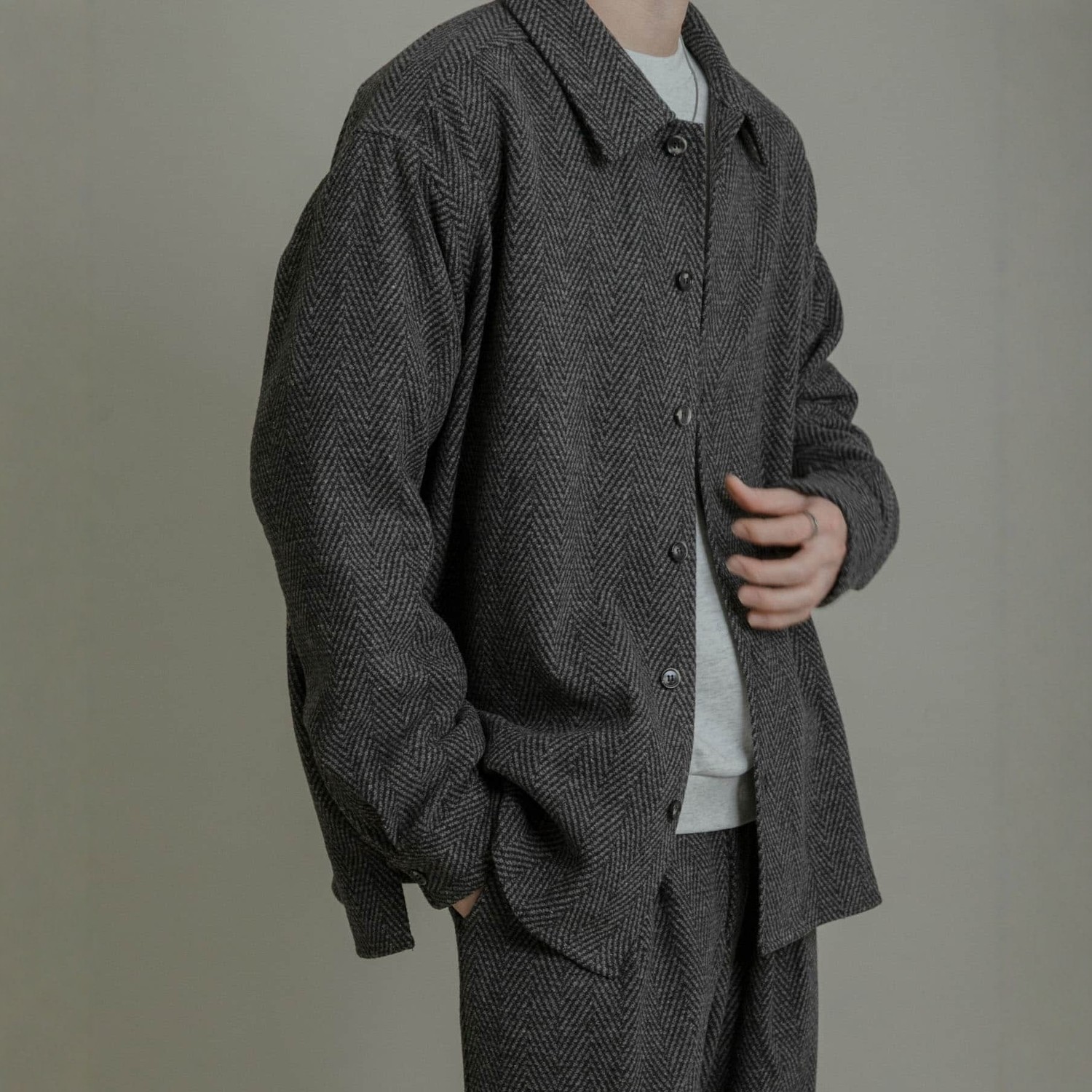 📚 儒雅绅士~客供轻量毛呢复古人字纹翻领宽松百搭衬衫外套