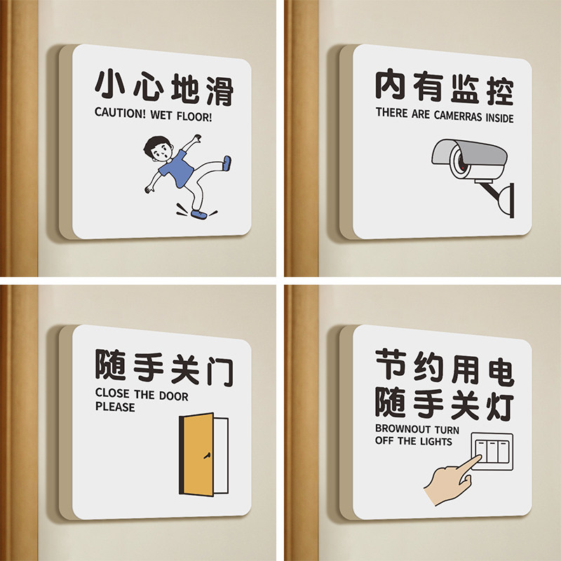 🔍定制的指示牌上清晰明了地写着:“小心地滑提示牌,请随手关门”。这句话简单易懂,让人一看就明白该怎么做。真的是非常人性化!