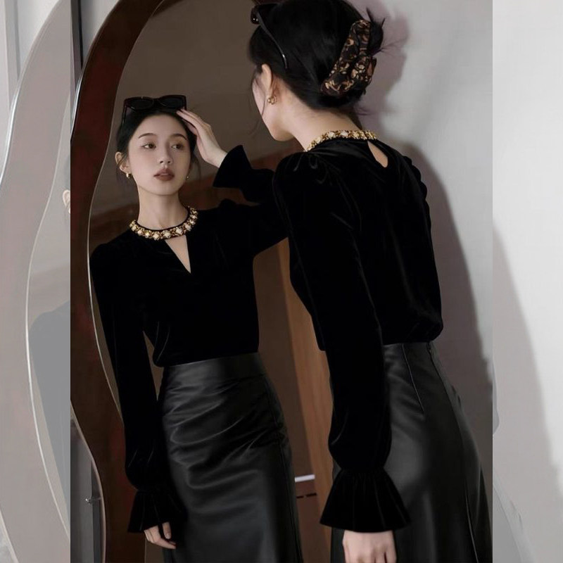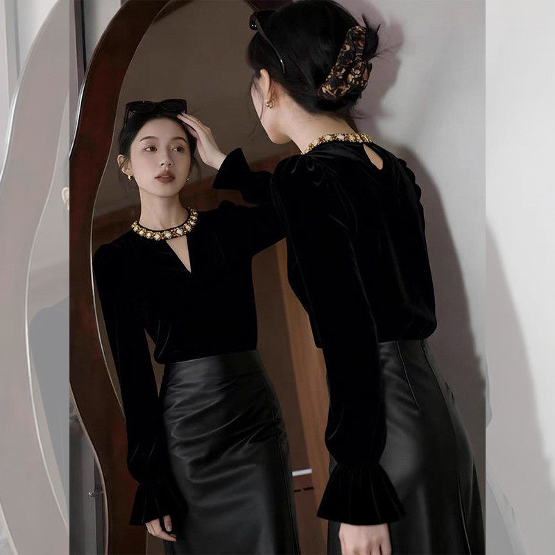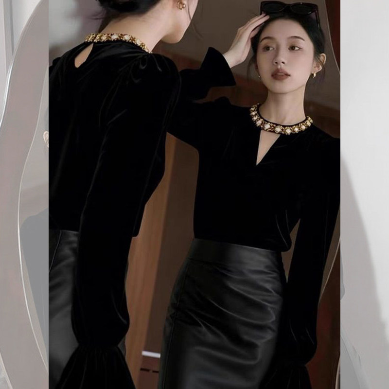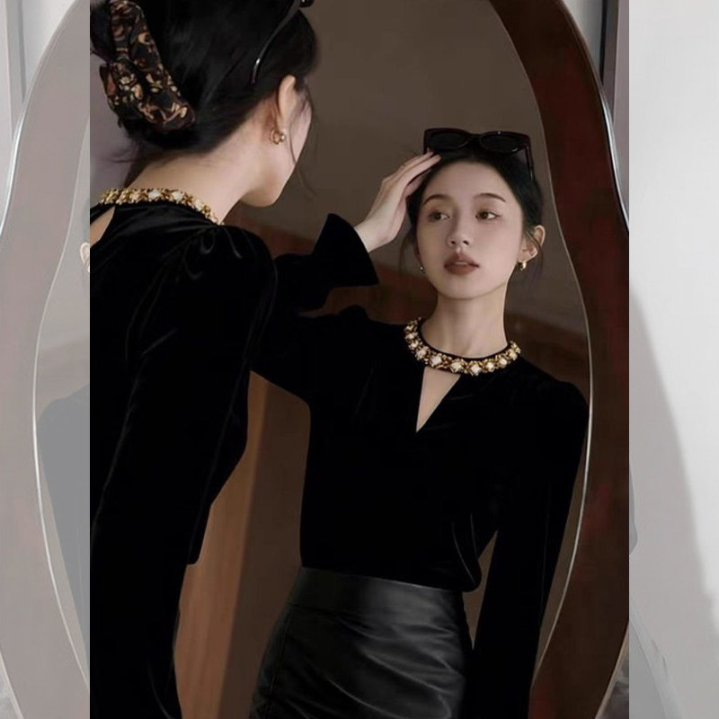 📚 赫本风钉珠黑色丝绒衬衫女款2026新款秋冬轻奢高级感气质女士上衣