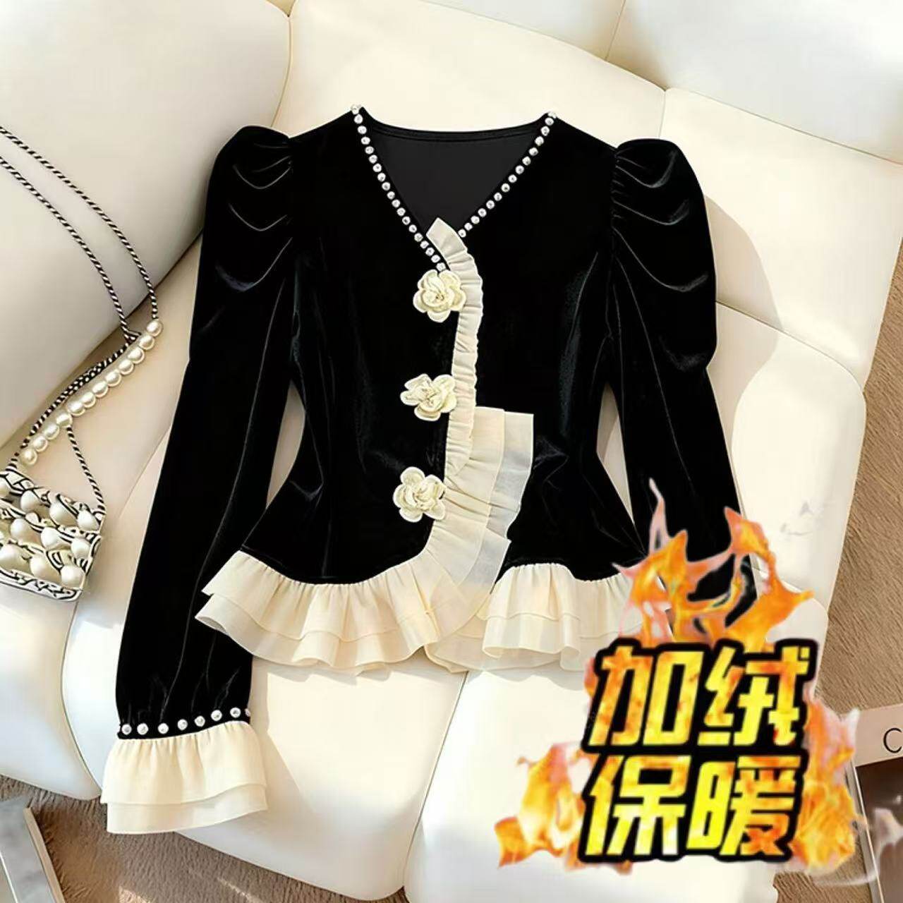📚 赫本风法式小众掐腰上衣女冬轻奢高端巨好看立体花朵黑色丝绒衬衫