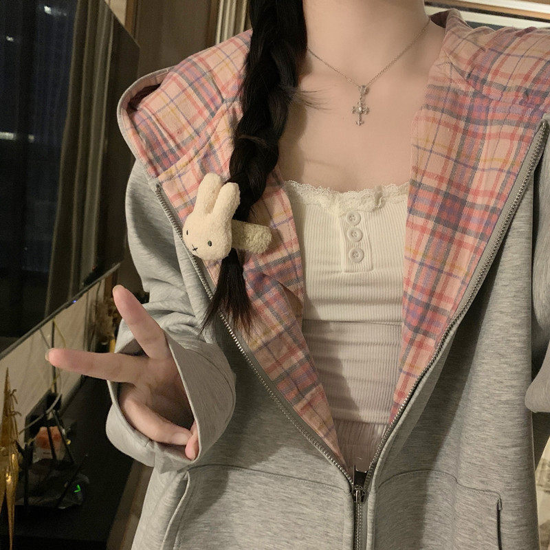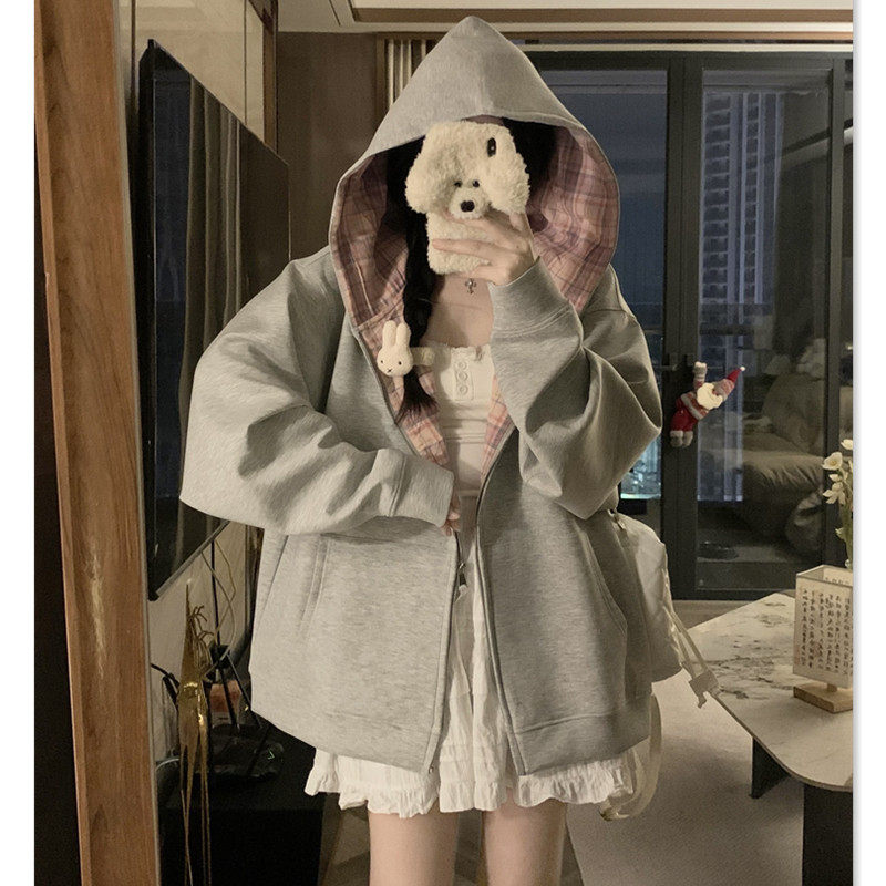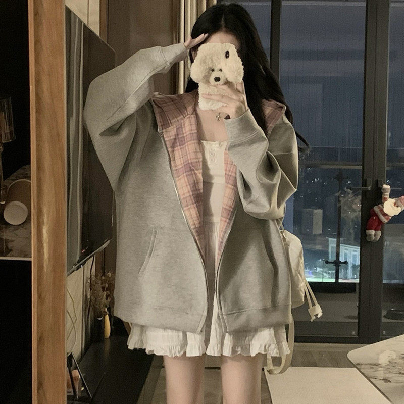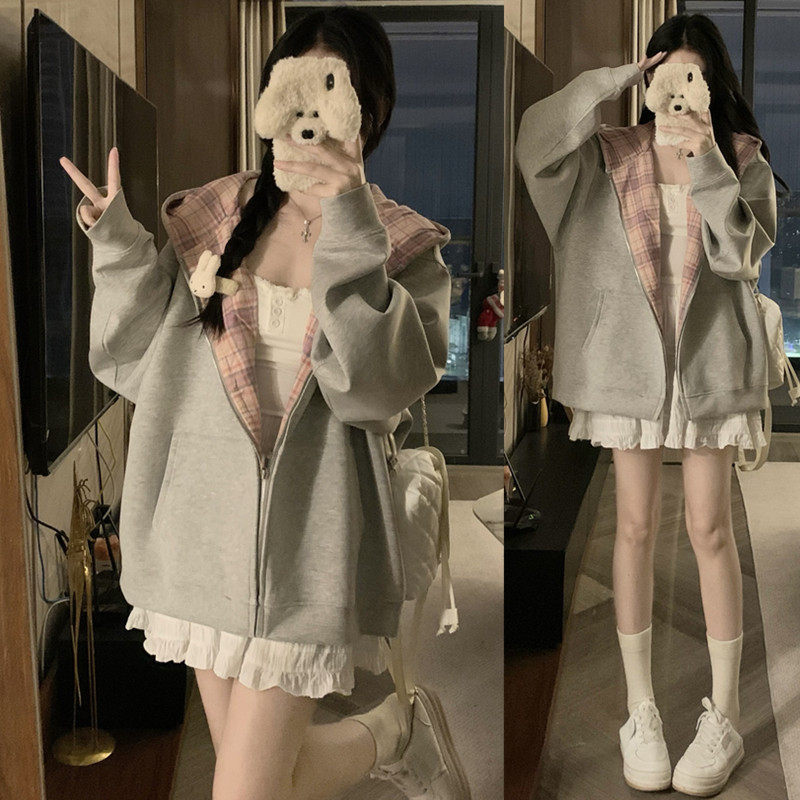 📚 慵懒风格子拼接连帽卫衣女2026年春秋新款宽松休闲初高中开衫外套