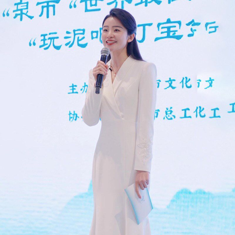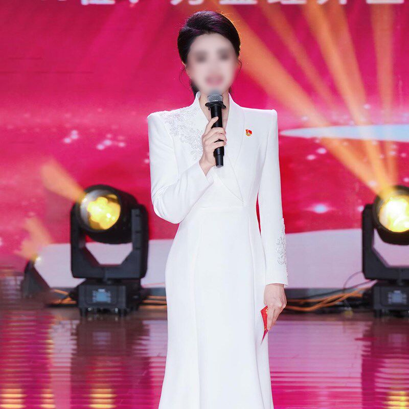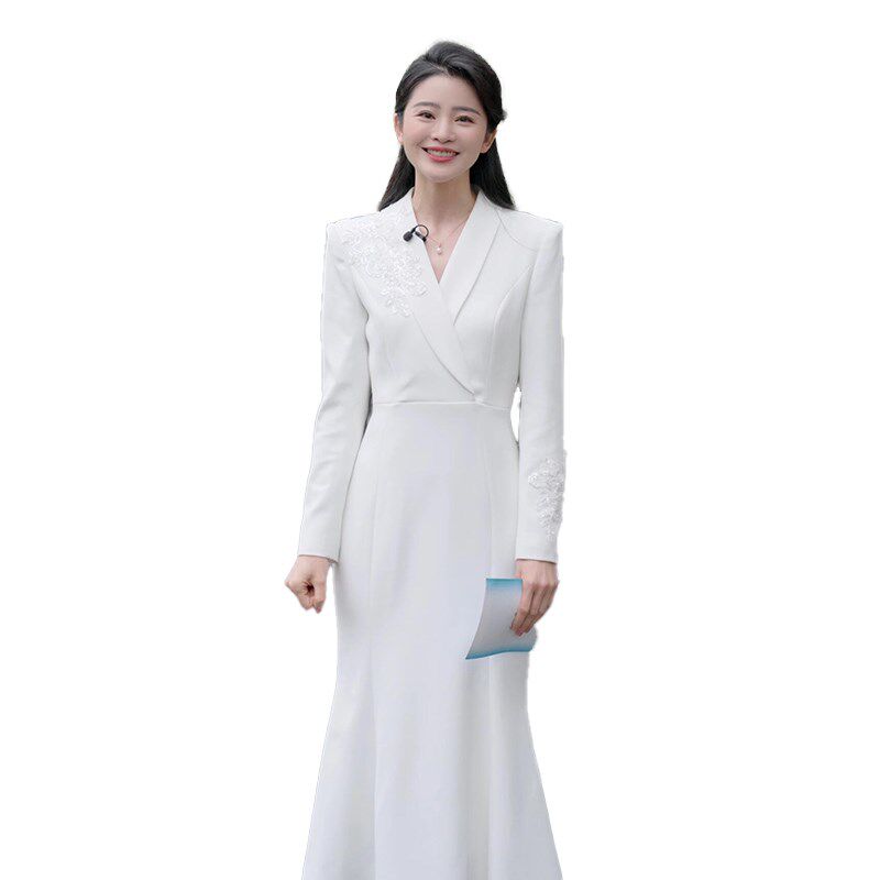 📚 新品主持人晚礼服女白色小众演讲艺考上镜播音连衣裙X端庄大气演