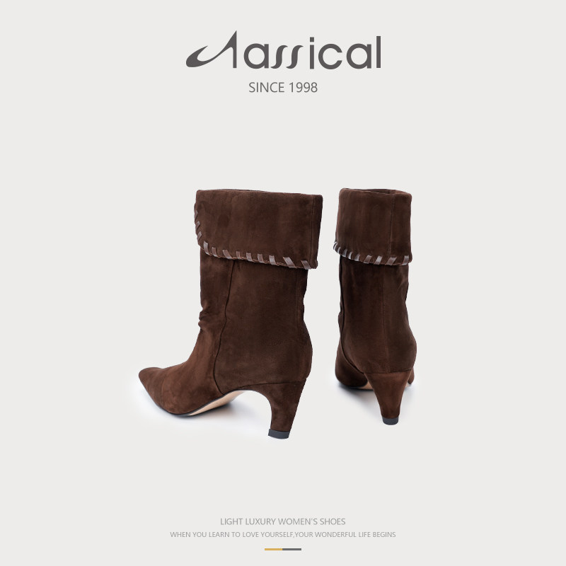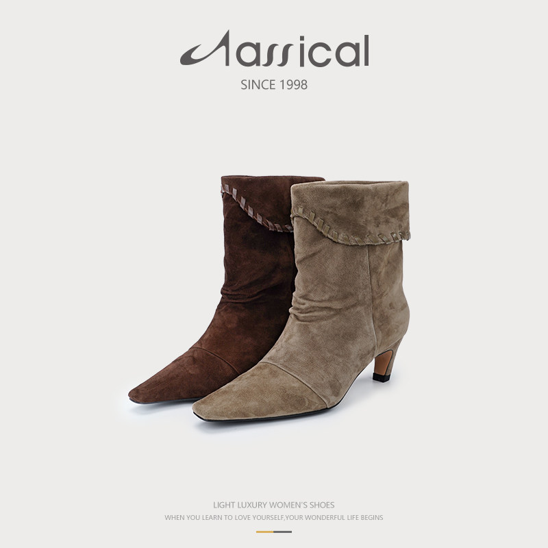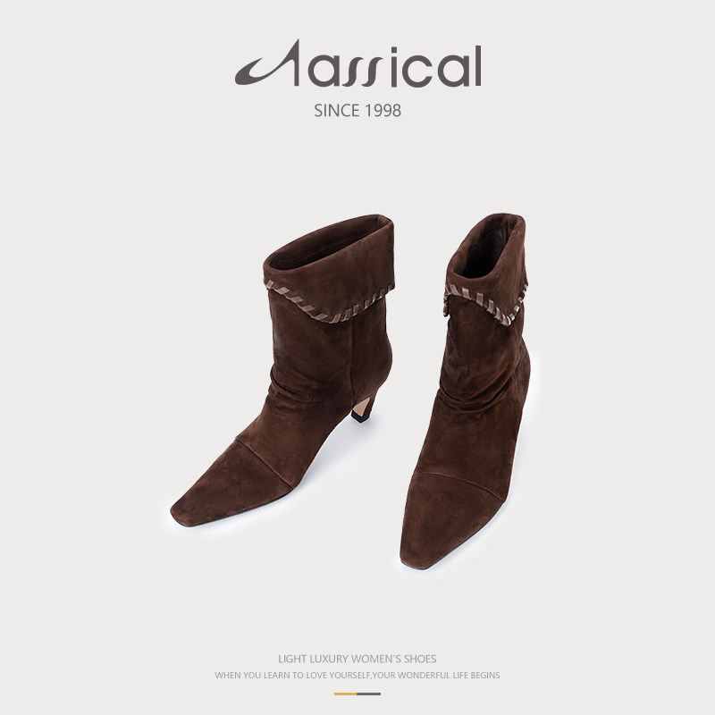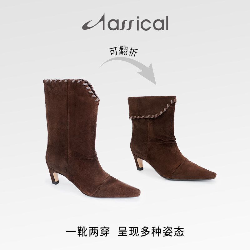📚 卡斯高冬真皮羊猄皮两穿粗中跟方头中筒显瘦百搭堆堆靴短靴女