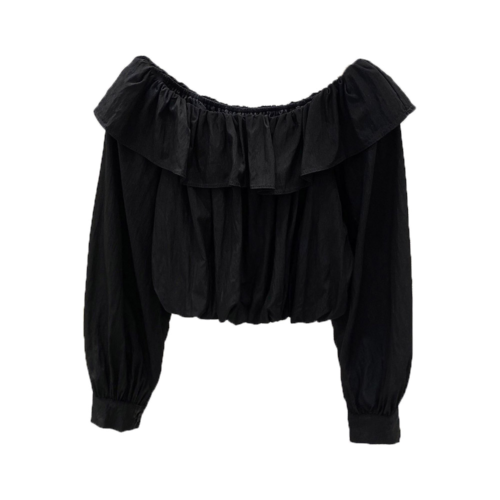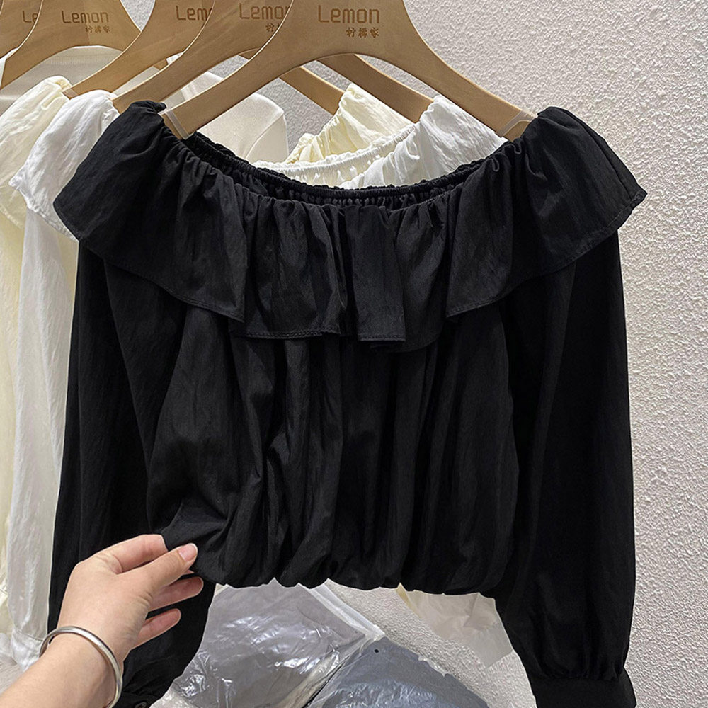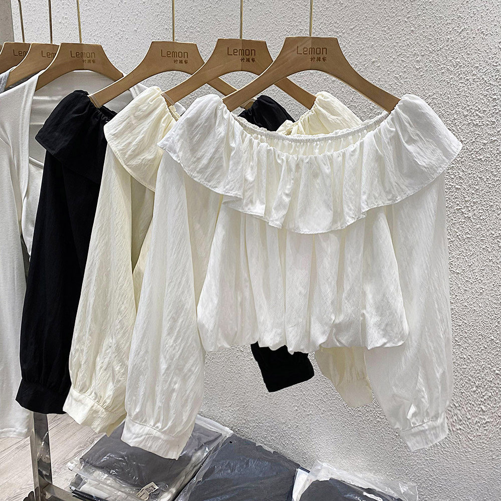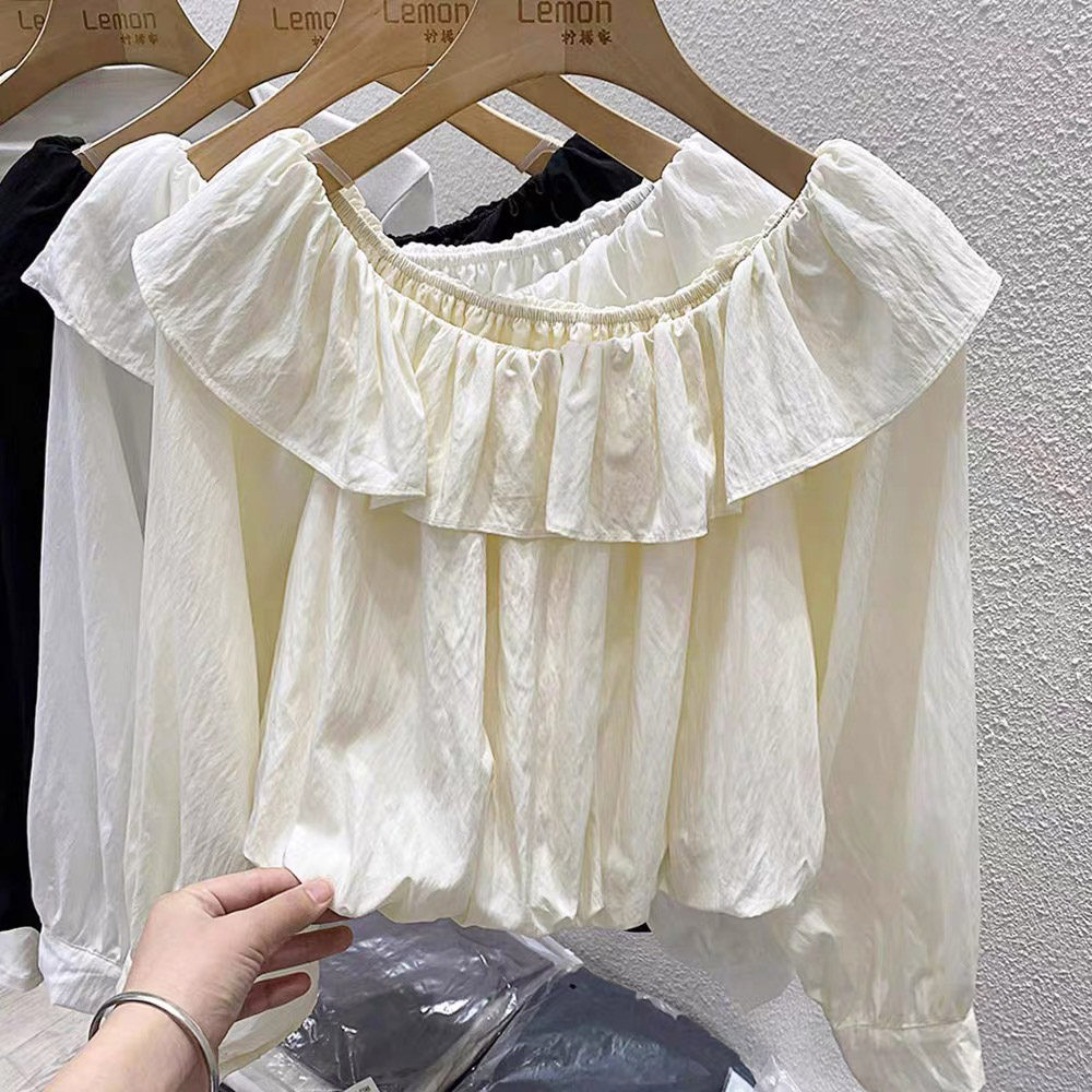 📚 法式一字肩chic上衣女早秋设计感小众白色气质雪纺荷叶边长袖衬衫