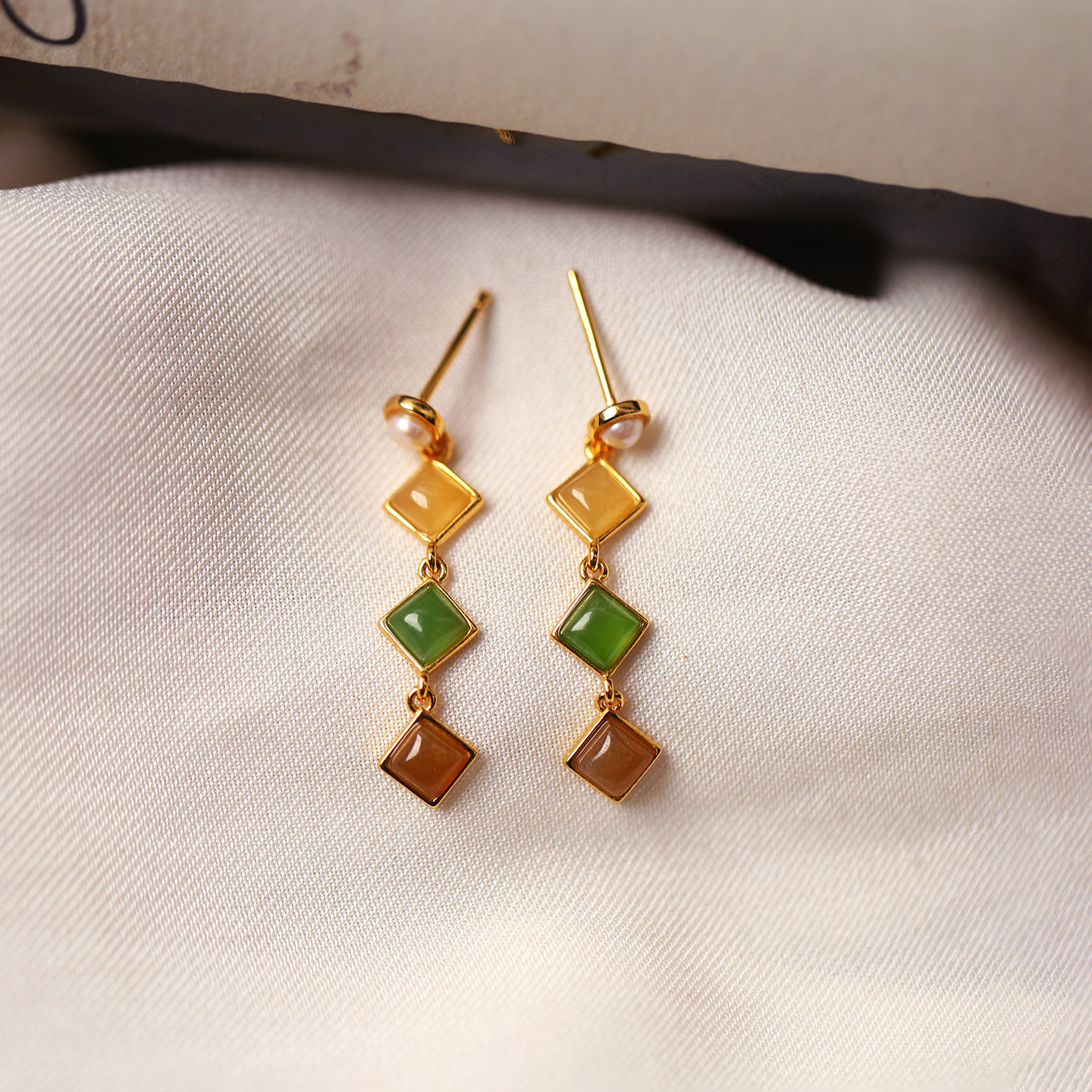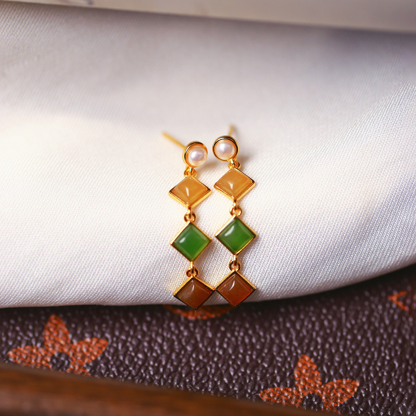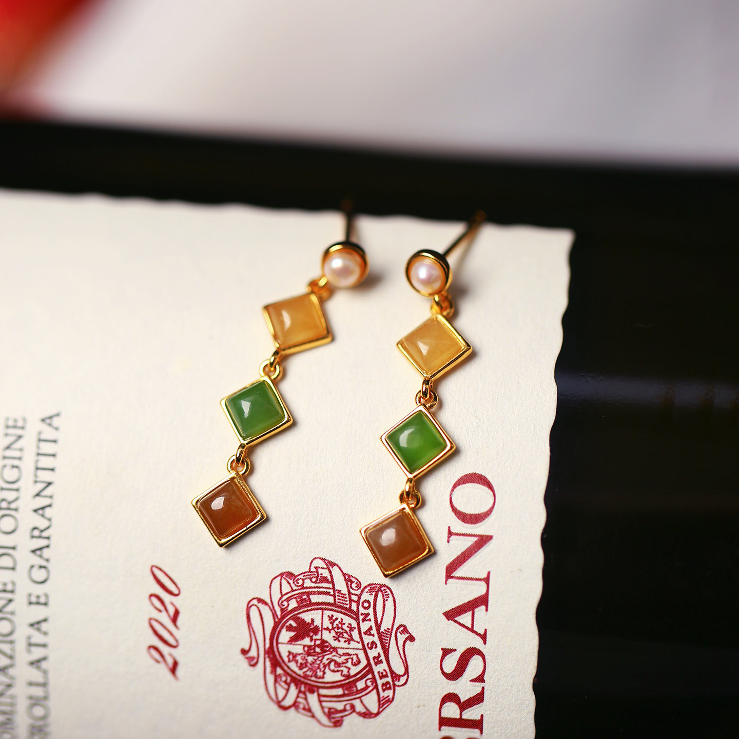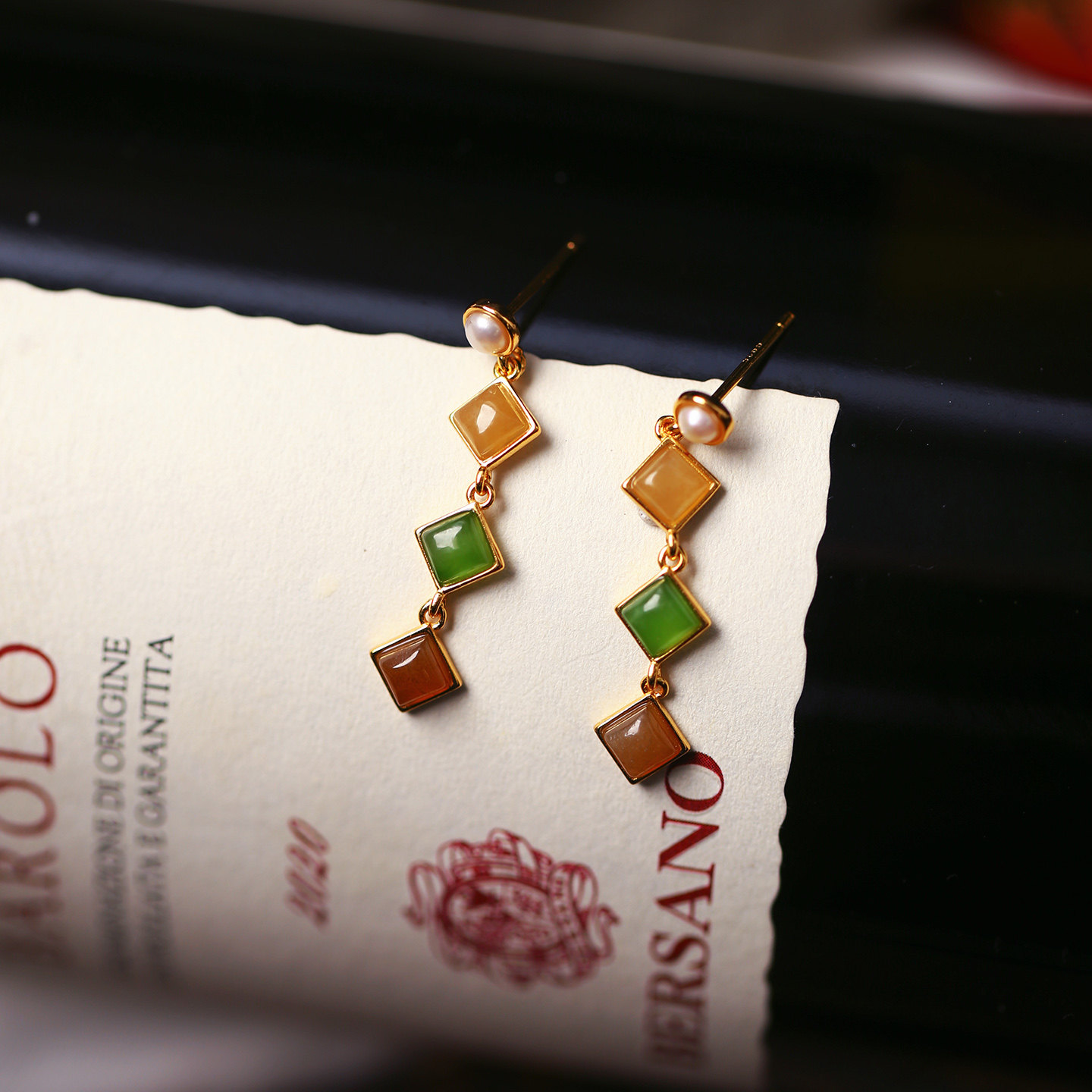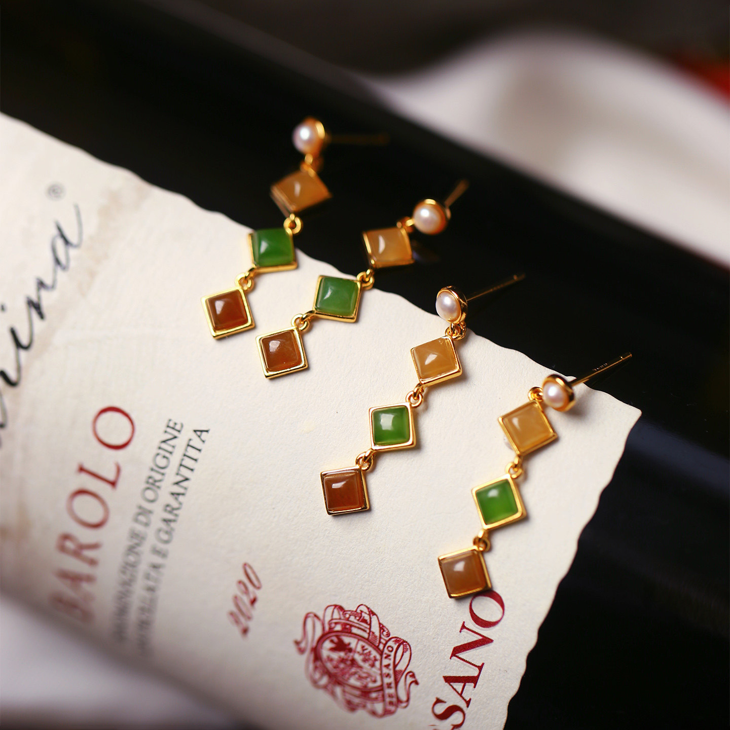 📚 天然和田玉菱形耳坠中长款糖料碧玉珍珠纯银镶嵌耳钩女玉石耳饰