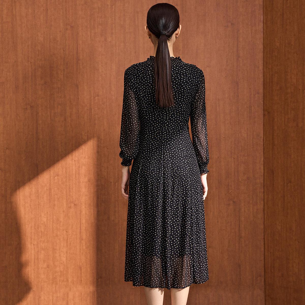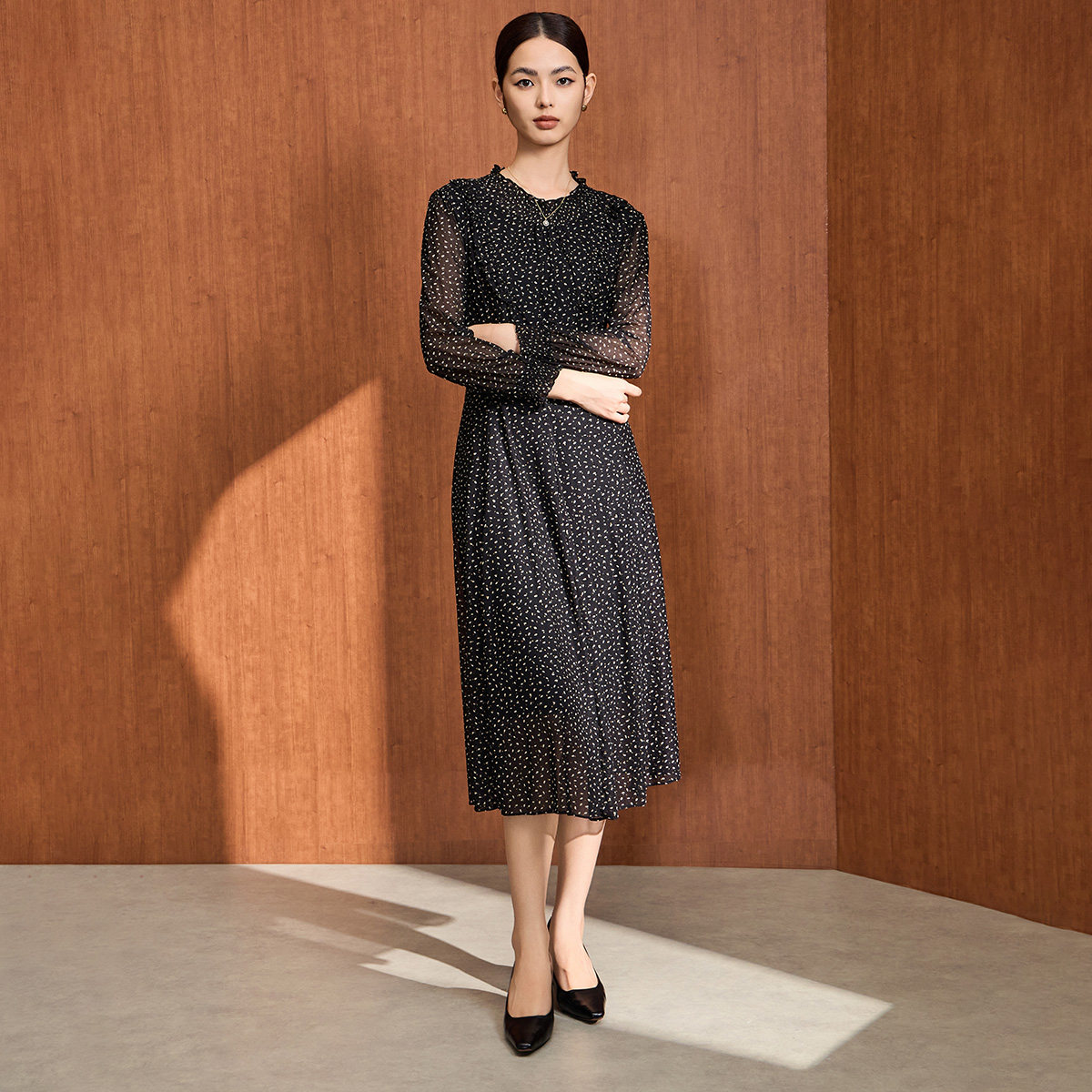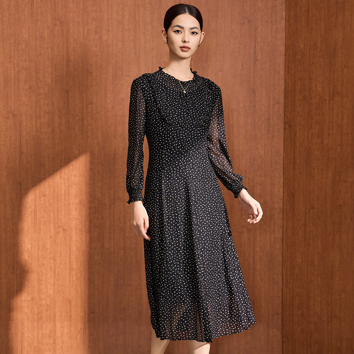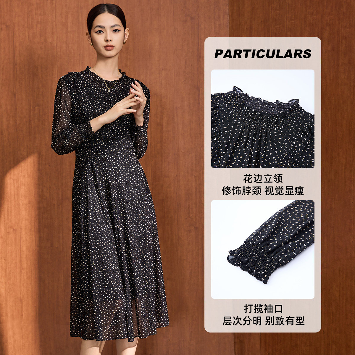 📚 马天奴秋季新款女装黑色闪葱印花连衣裙长袖收腰长裙气质时尚裙子