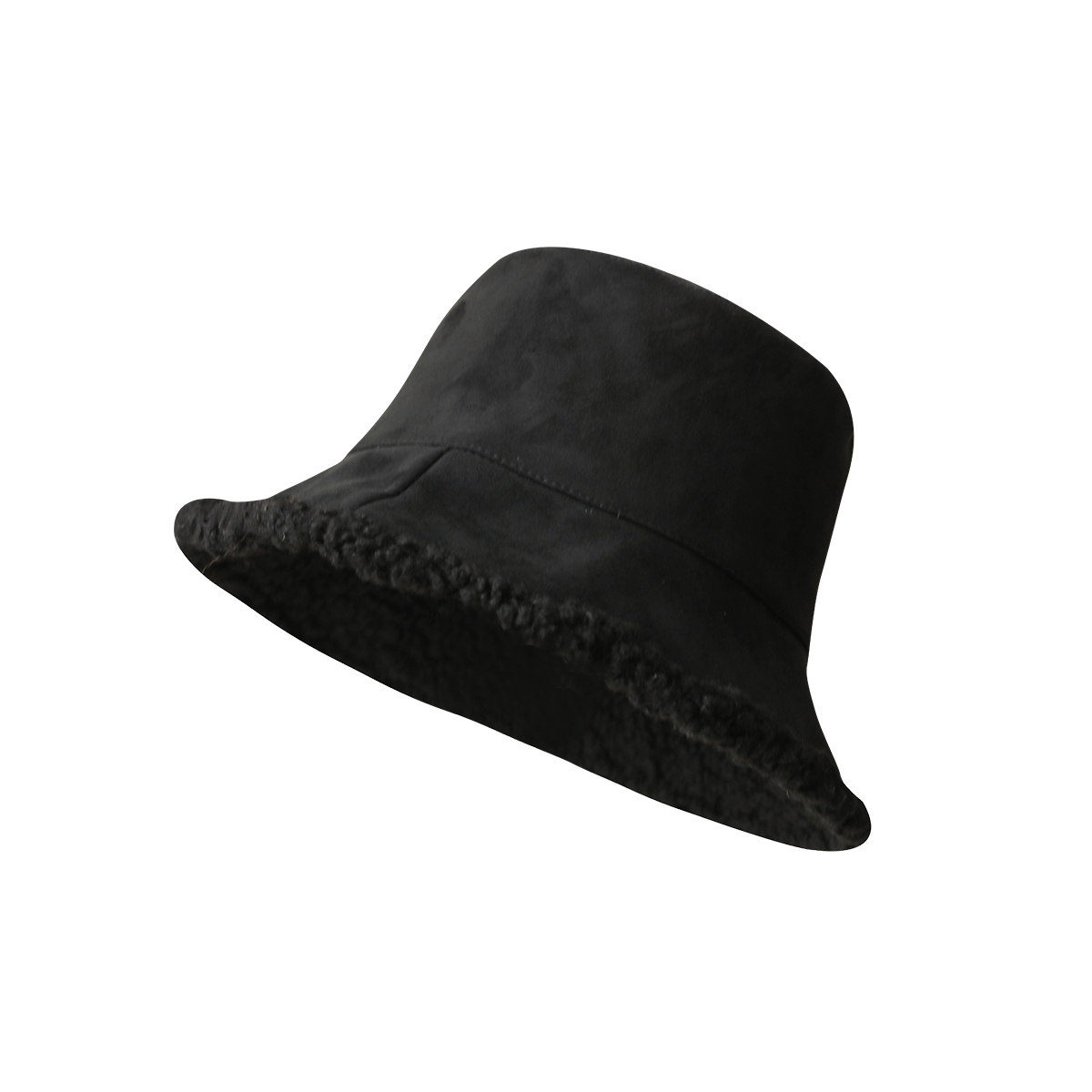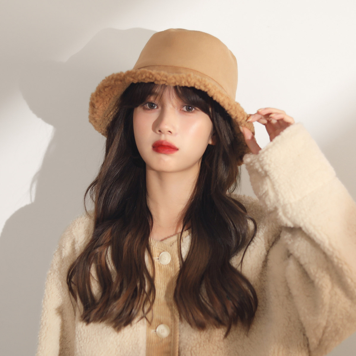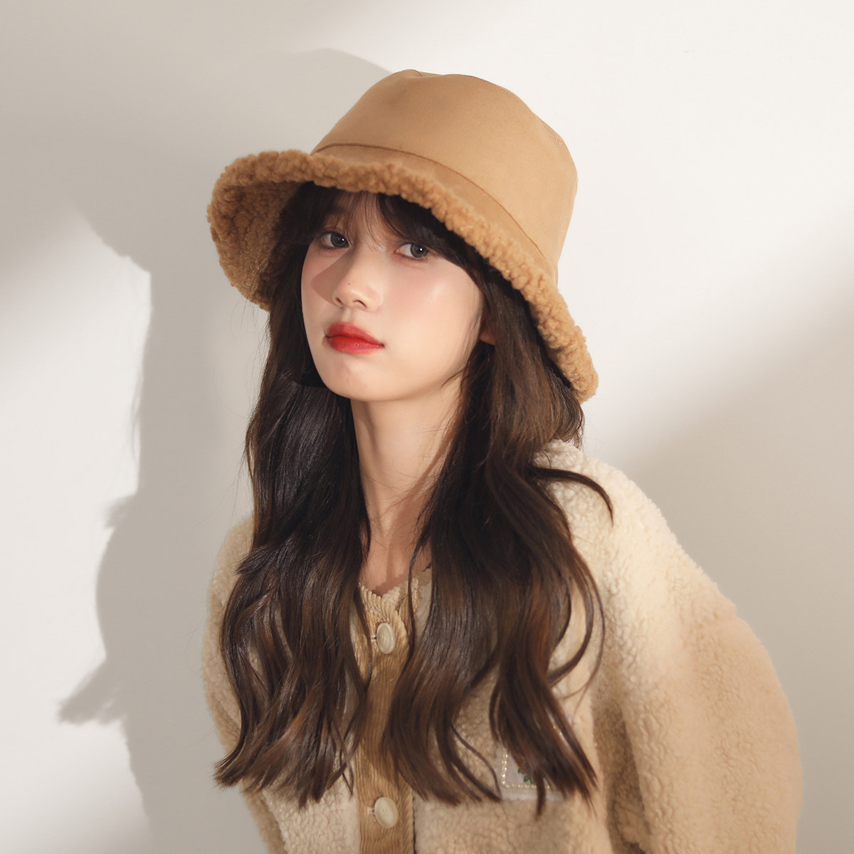 📚 冬季鹿皮绒渔夫帽女双面戴羊羔绒保暖帽子百搭杏色宽檐显脸小盆帽