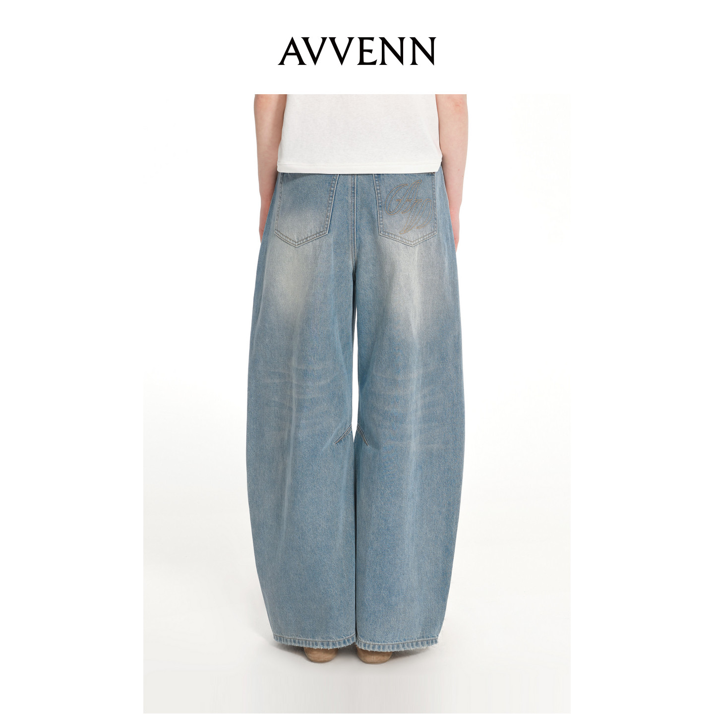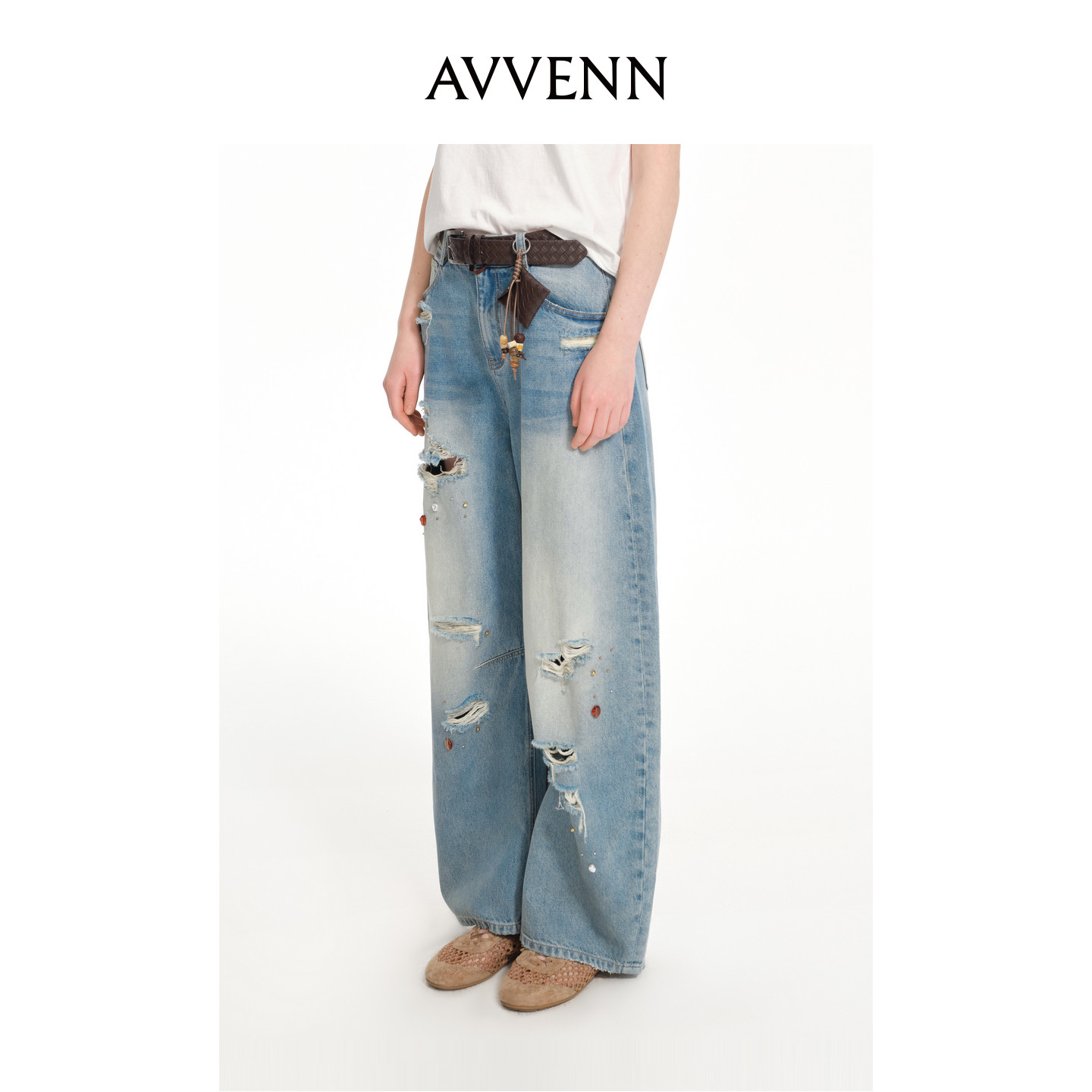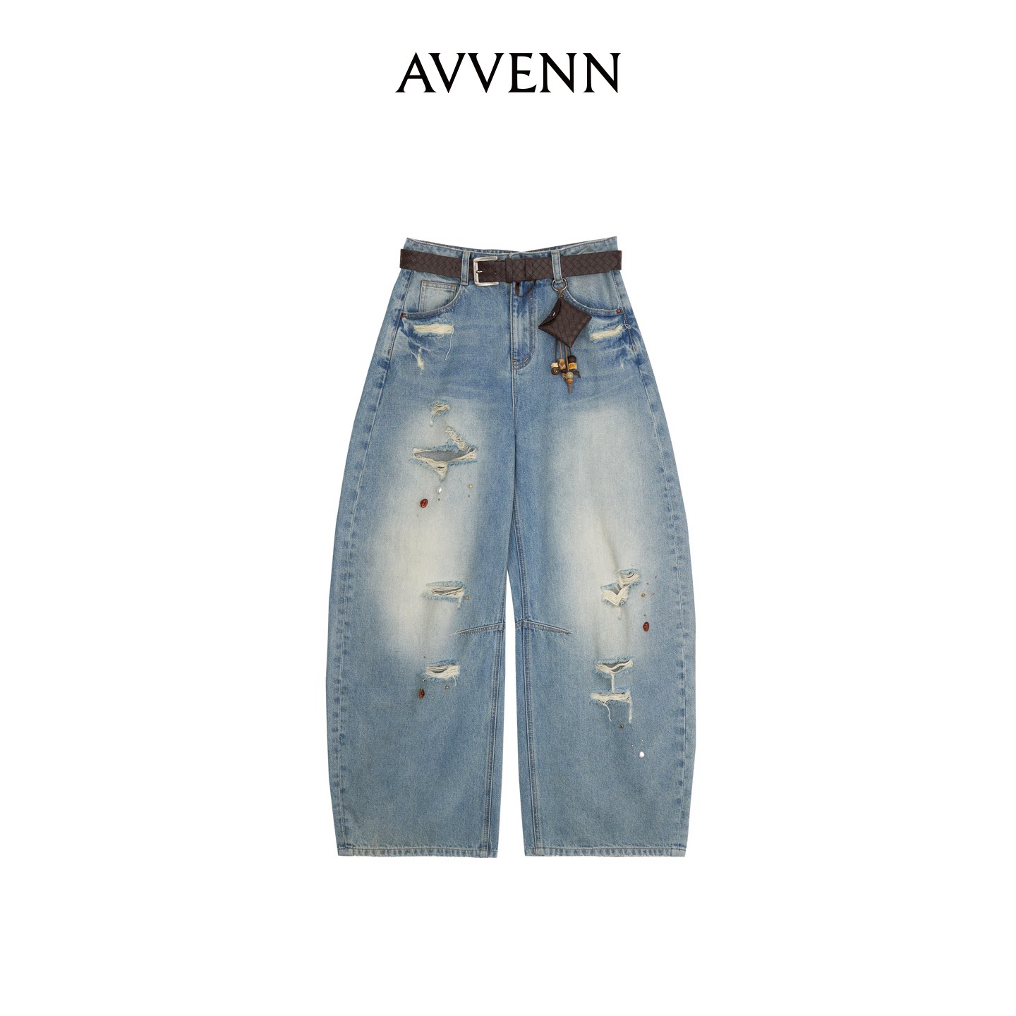 📚 AVVENN蓝色破洞金属绣花可拆卸腰包牛仔长裤 AK31302611