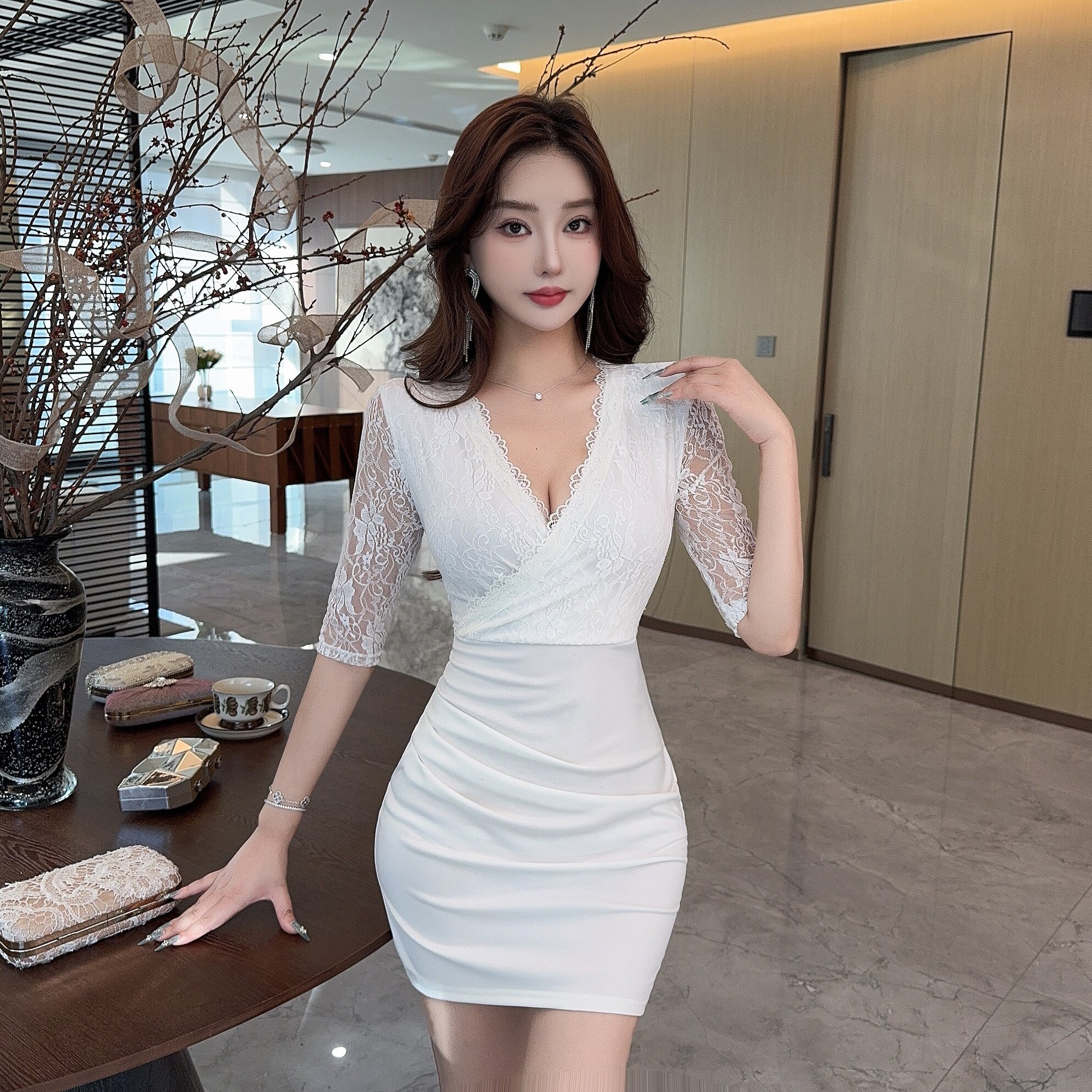 📚 名媛气质夜场衣服性感低胸深V领蕾丝连衣裙女装修身显瘦包臀短裙