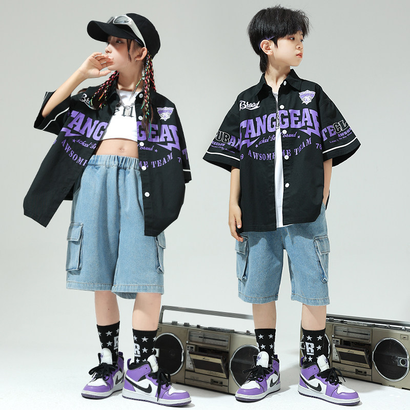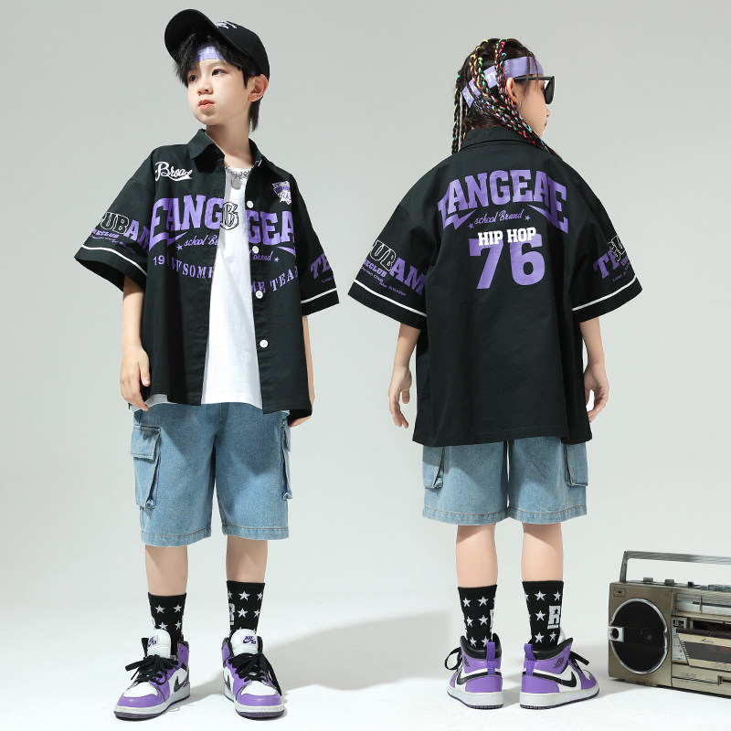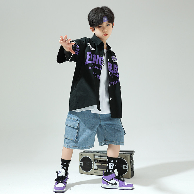 📚 popping衣服儿童演出服吉他男童夏季街舞服装衬衣炸街痞帅短袖潮