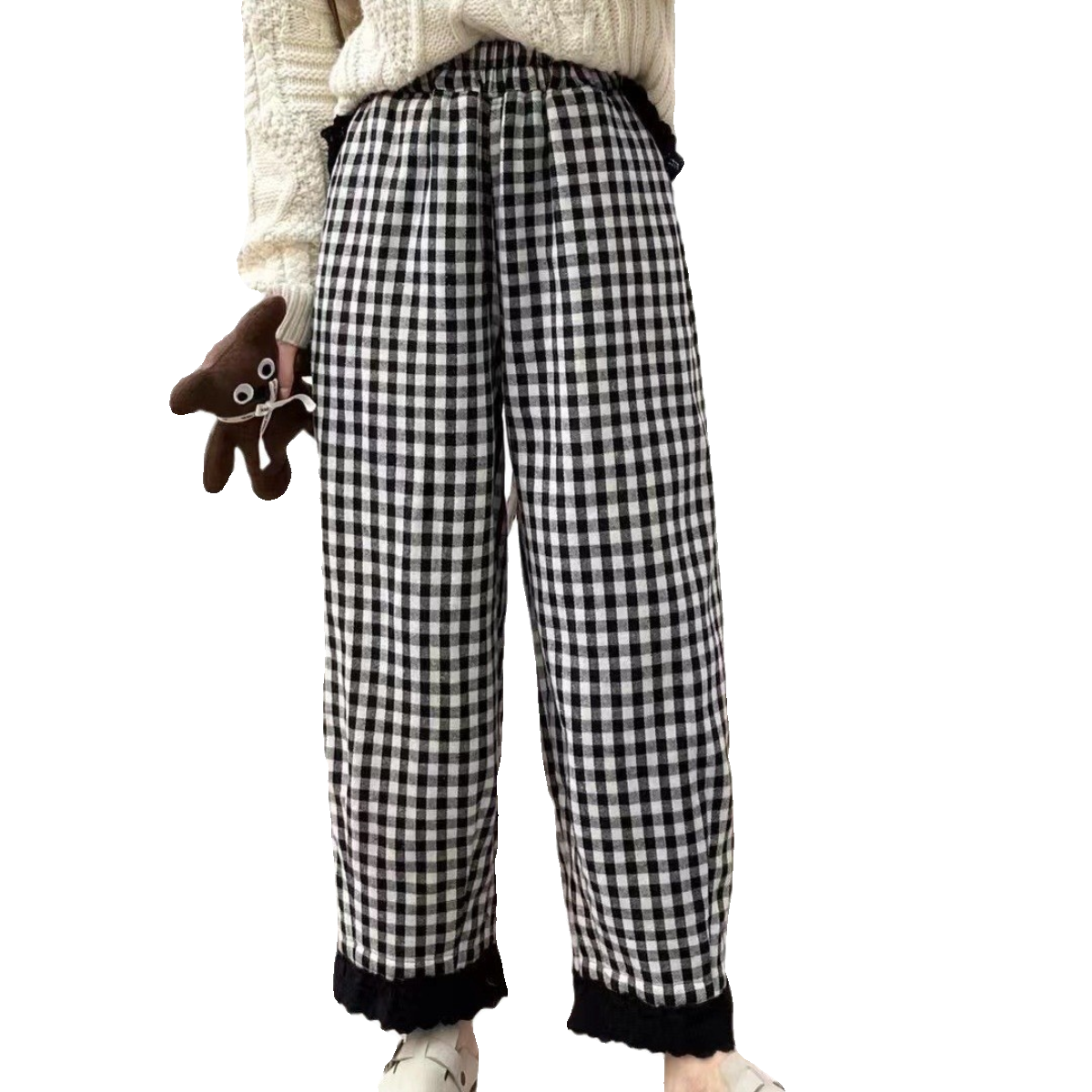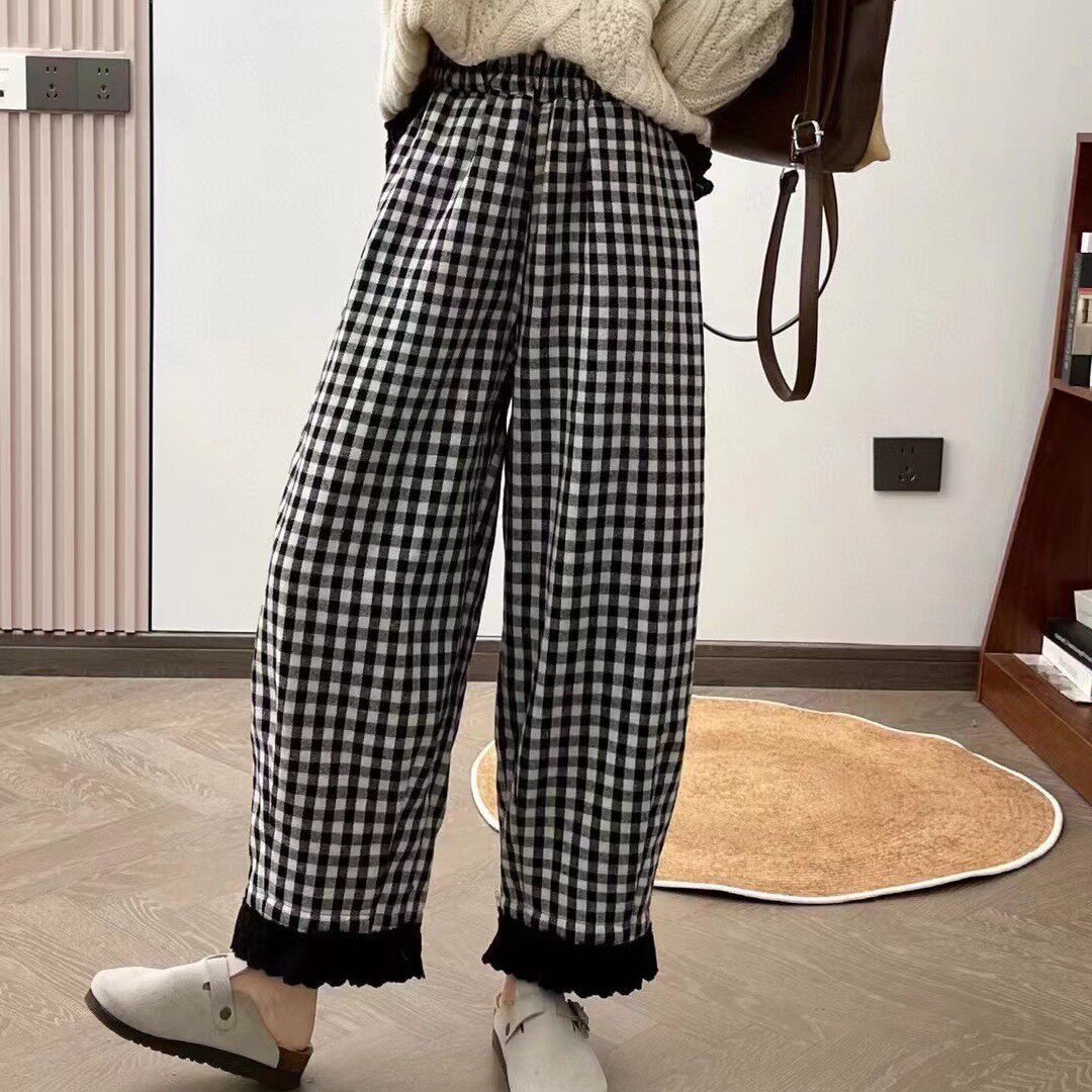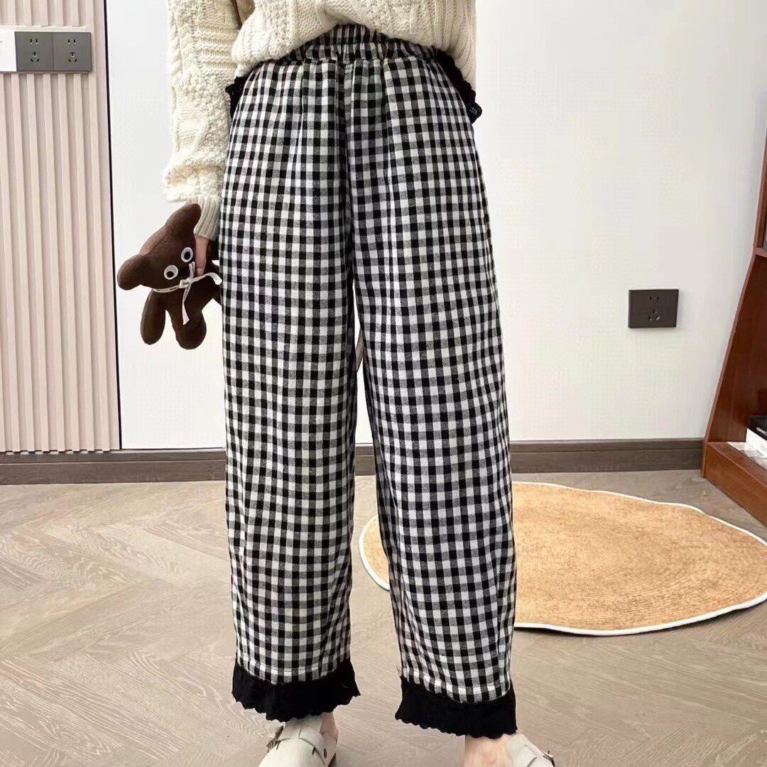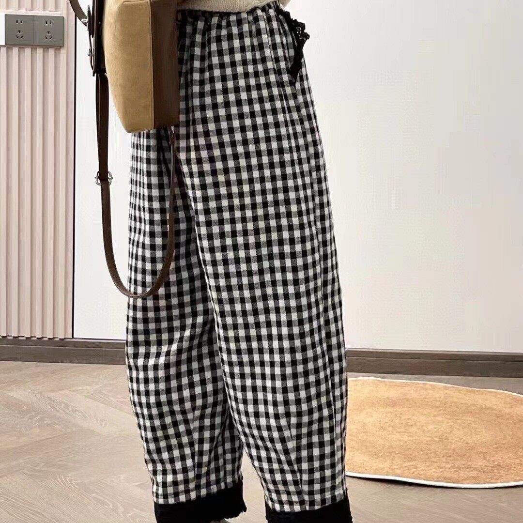 📚 日系森系加棉格子哈伦裤女秋冬新款裤脚蕾丝翻边减龄文艺百搭裤子