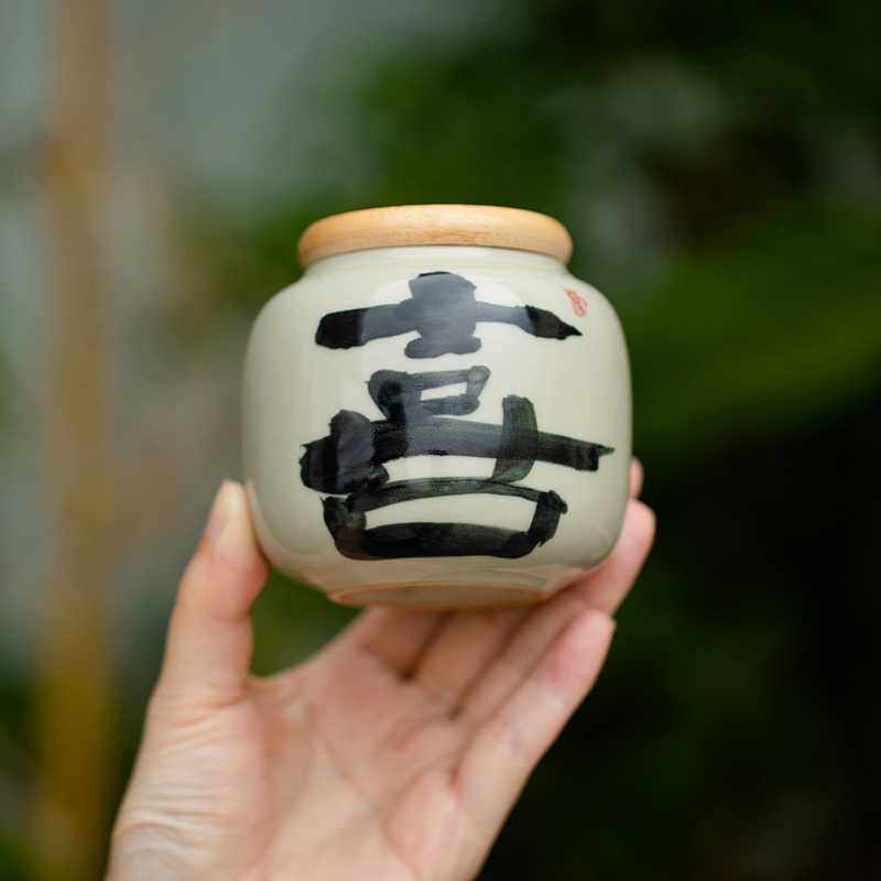 📚 家用陶瓷茶叶罐小号迷你密封罐岩茶红茶纯手写欢喜储存罐防潮