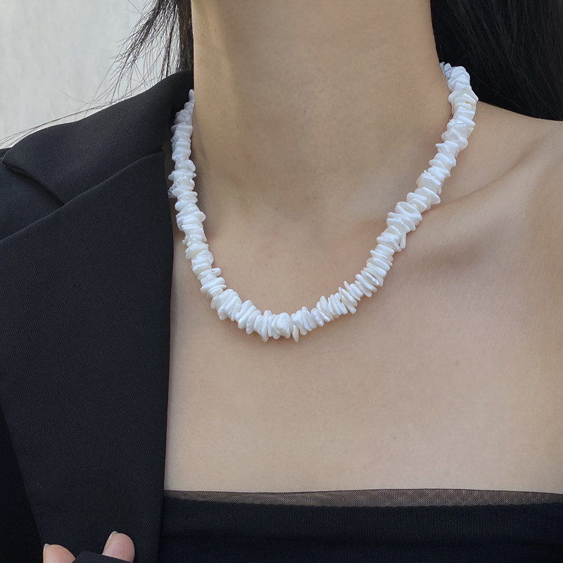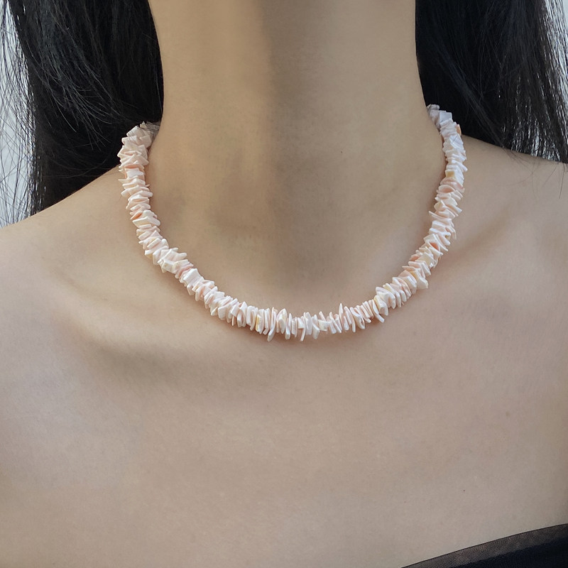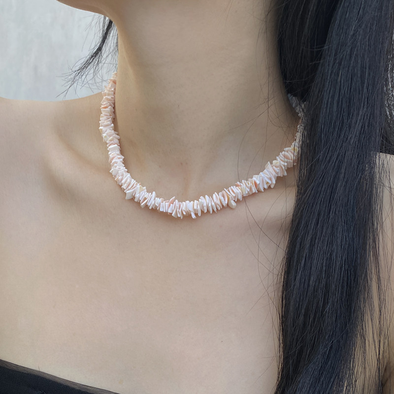 📚 日韩天然碎石短项链女极简高级感性冷淡风不规则贝壳白粉串珠项链