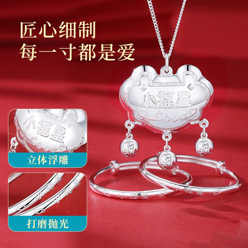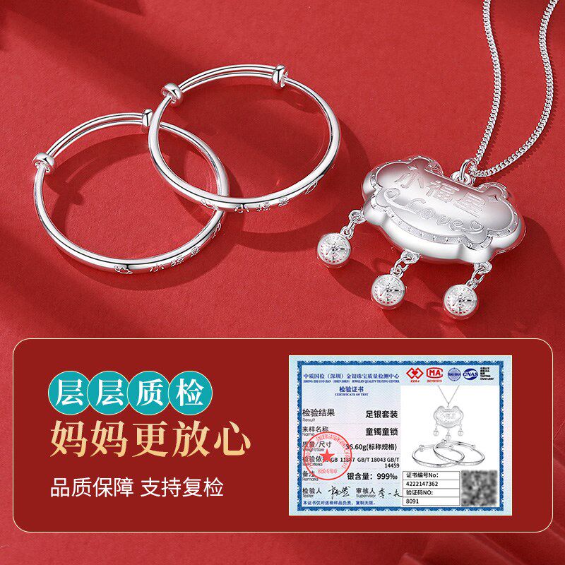 📚 宝宝银手镯999纯银婴儿长命锁儿童银锁小孩男女满月银饰礼物