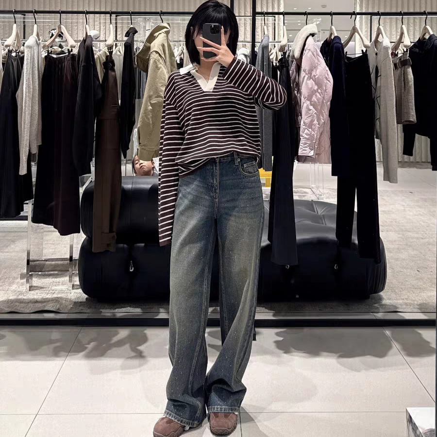 📚 正品2025冬新品怀旧靛蓝棉质渐变烫钻中高腰直筒牛仔裤MBE4JEN015