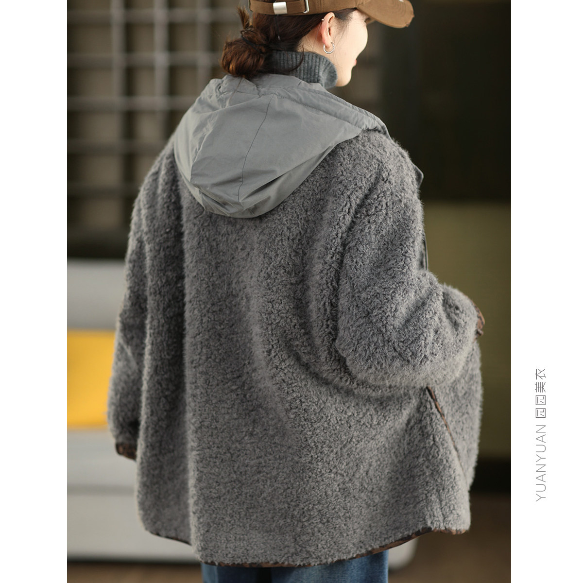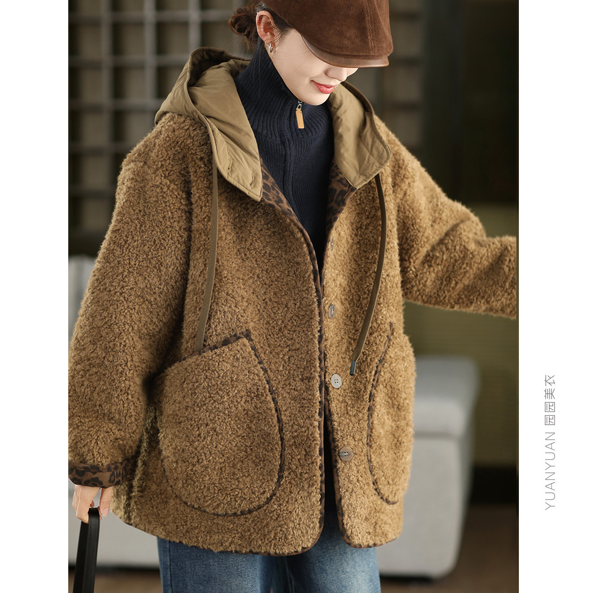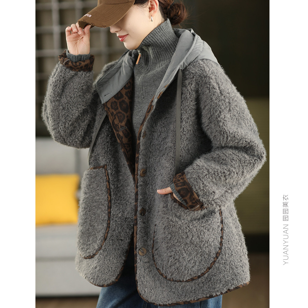 📚 冬季羊羔毛加厚拼接连帽外套女内里豹纹麂皮绒保暖中长款皮毛一体