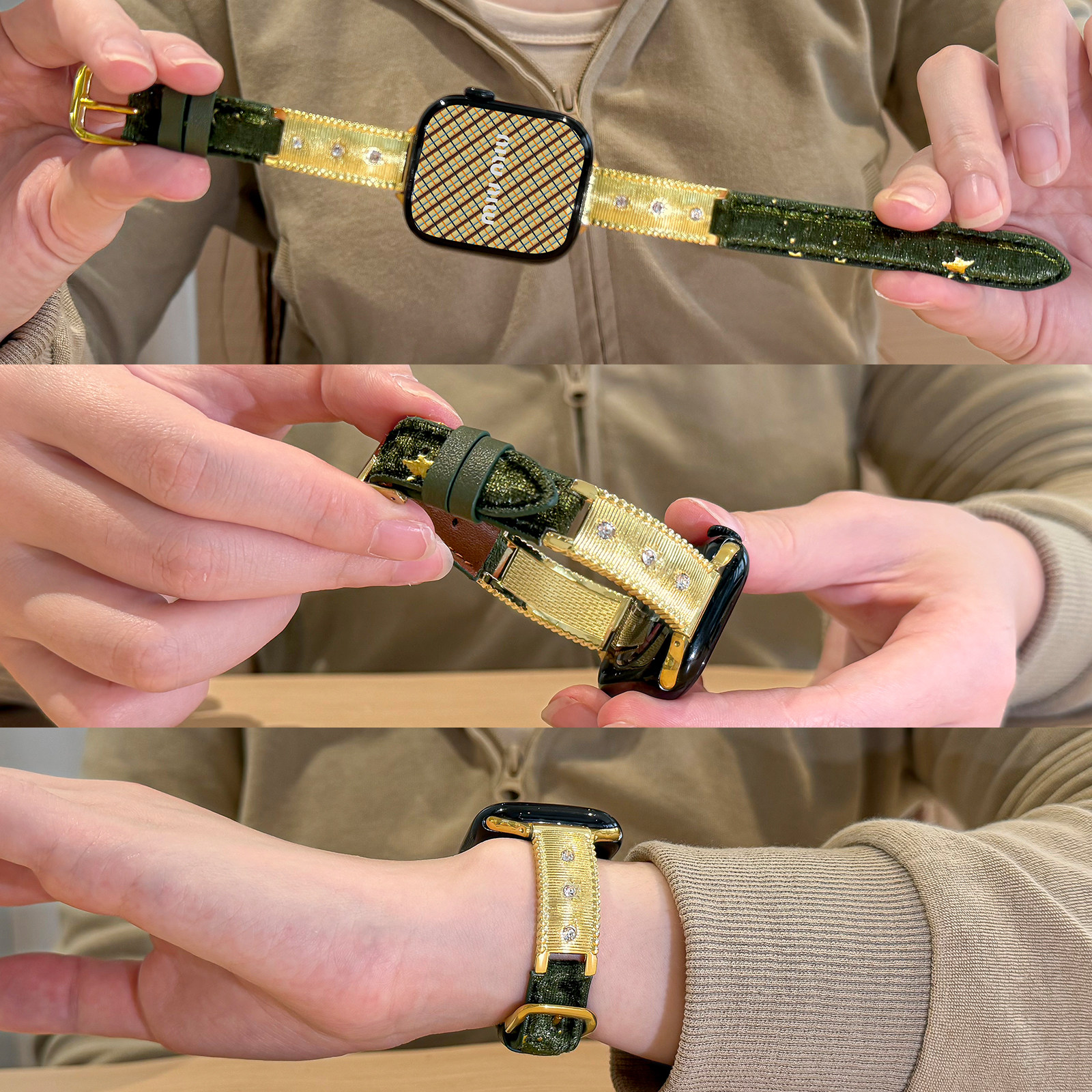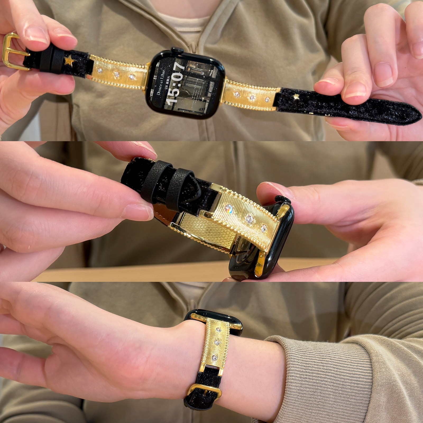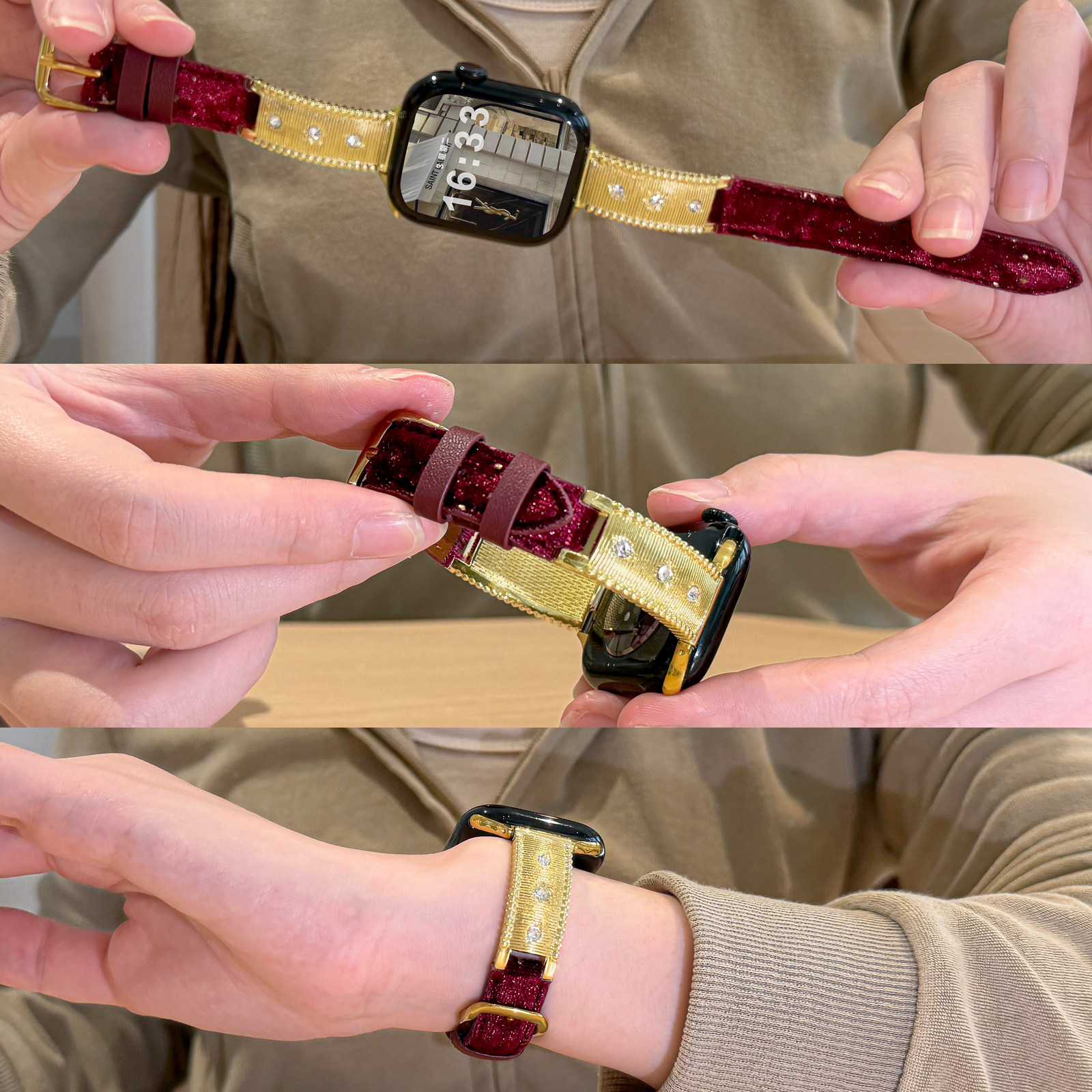📚 适用applewatchS11星芒丝绒手镯款拼皮表带iWatch10/9/8/7高级千金风苹果手表ultra闪钻质感女小蛮腰金属腕带