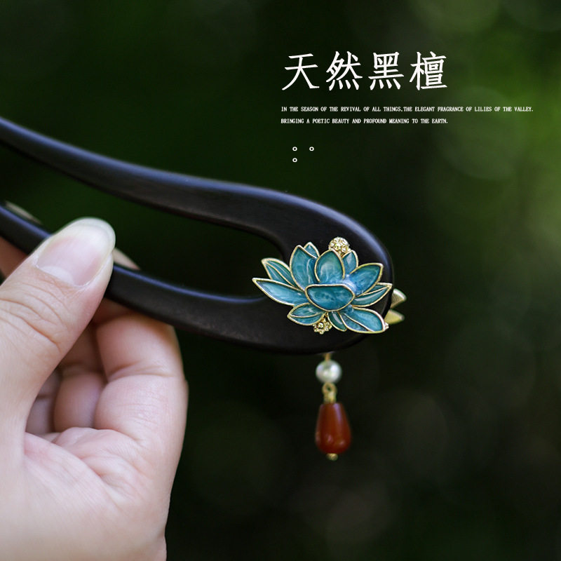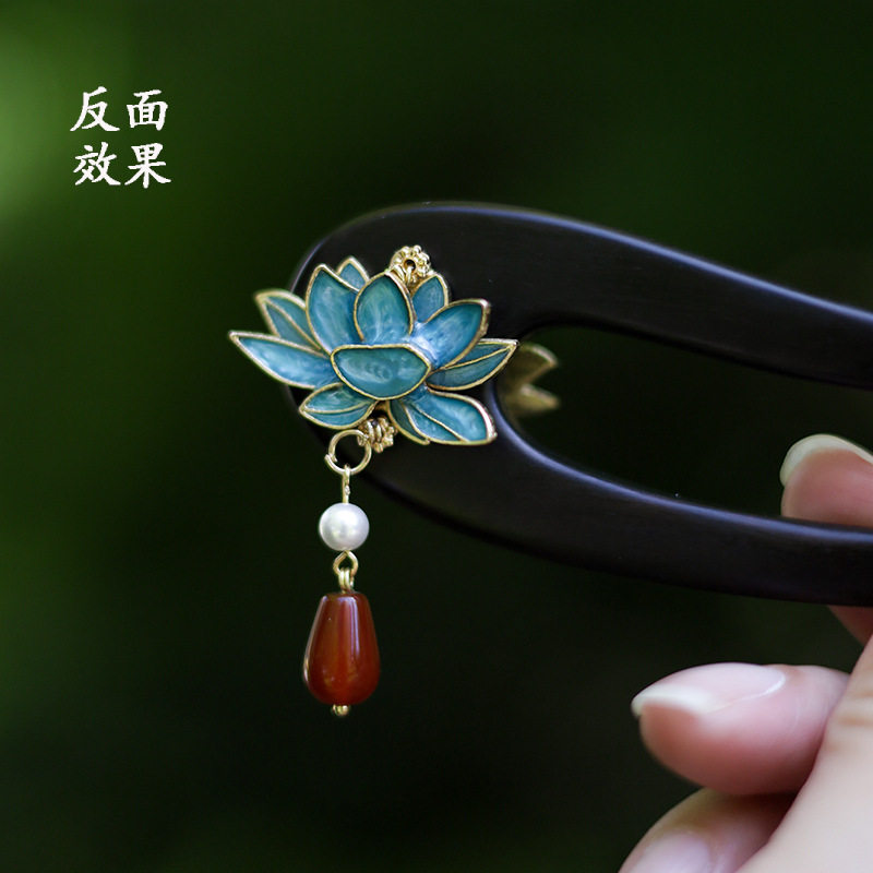 📚 13CM蓝色发簪u型流苏古风黑檀木短款双面莲花景泰蓝国风旗袍簪子
