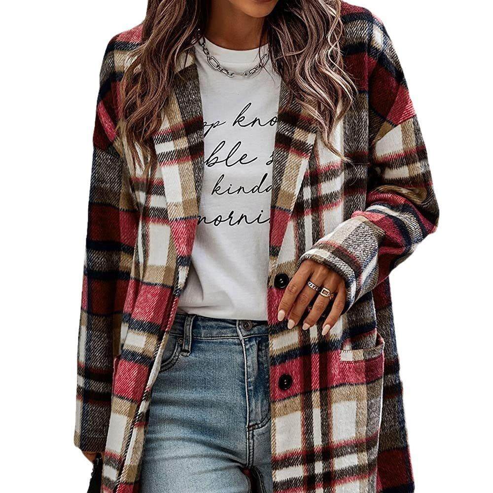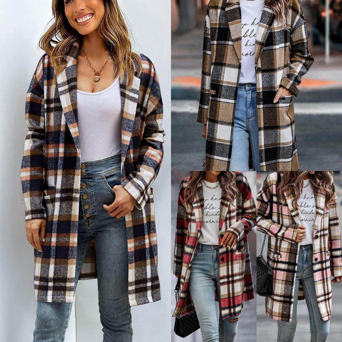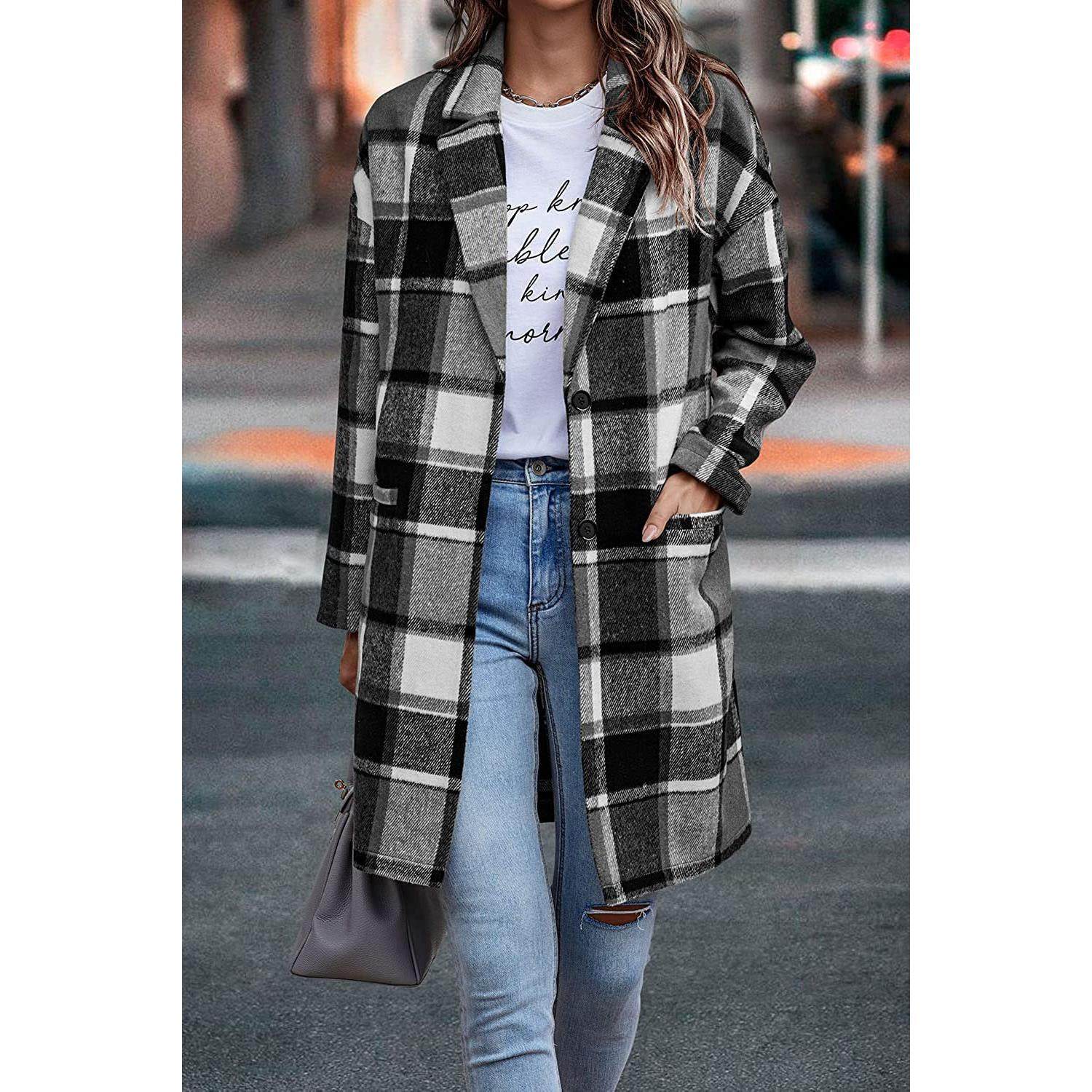 📚 Ladies Lapel Pocket Plaid Wool Coat