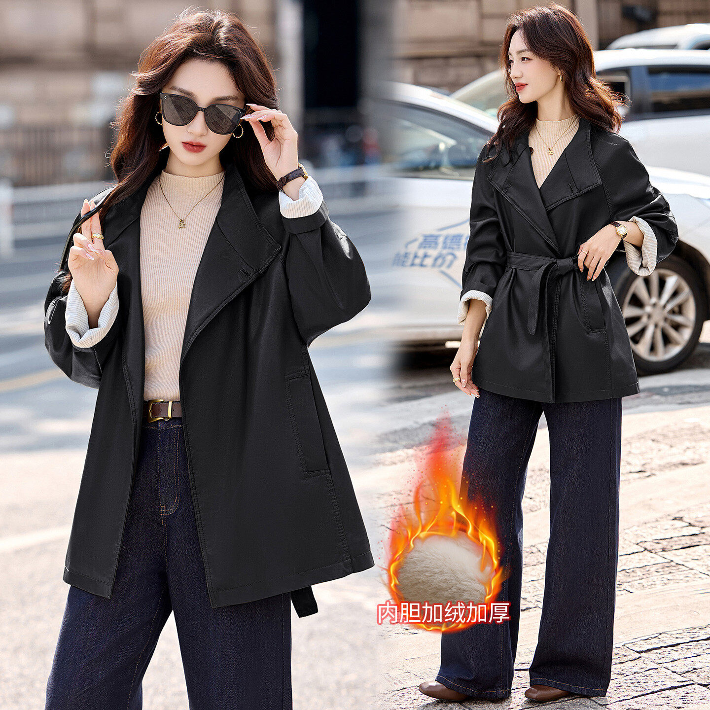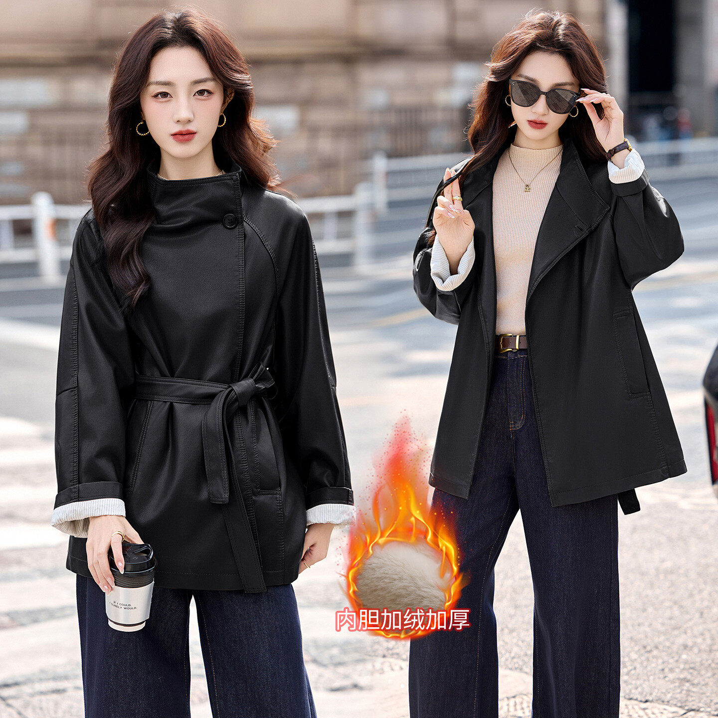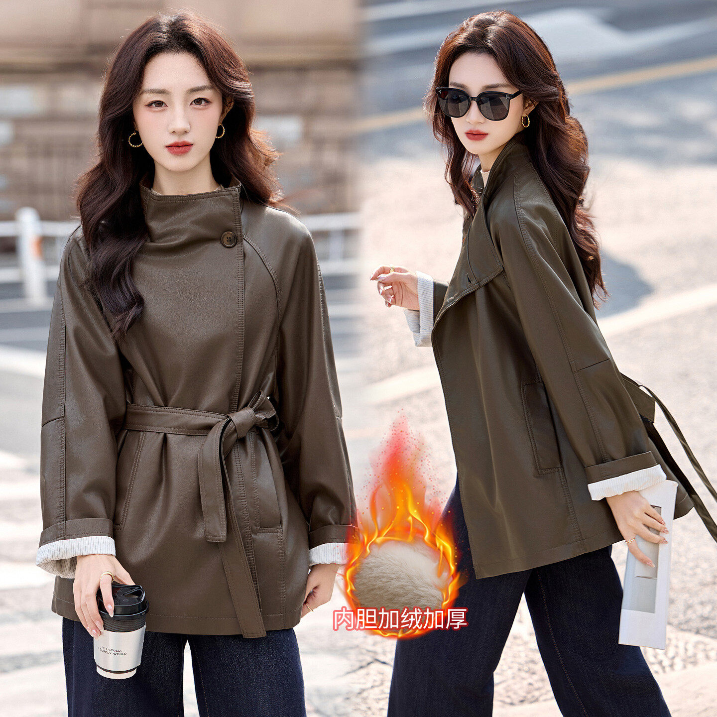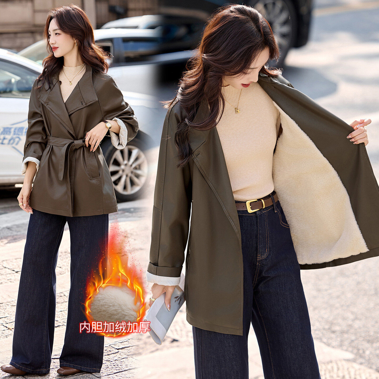 📚 美拉德加绒加厚皮衣外套女中长款韩系百搭系带风衣皮夹克