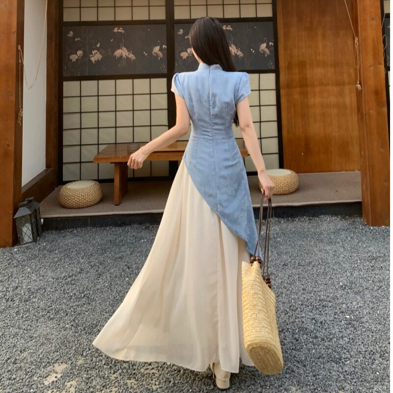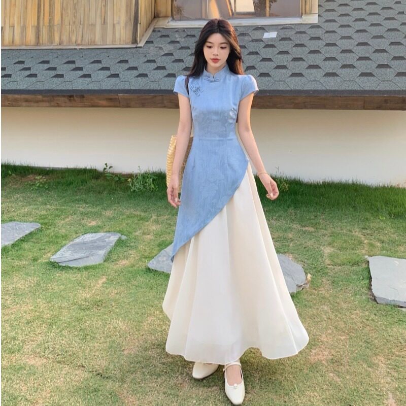 📚 大码新中式提花假两件短袖连衣裙女夏季胖mm温柔收腰旗袍长裙子
