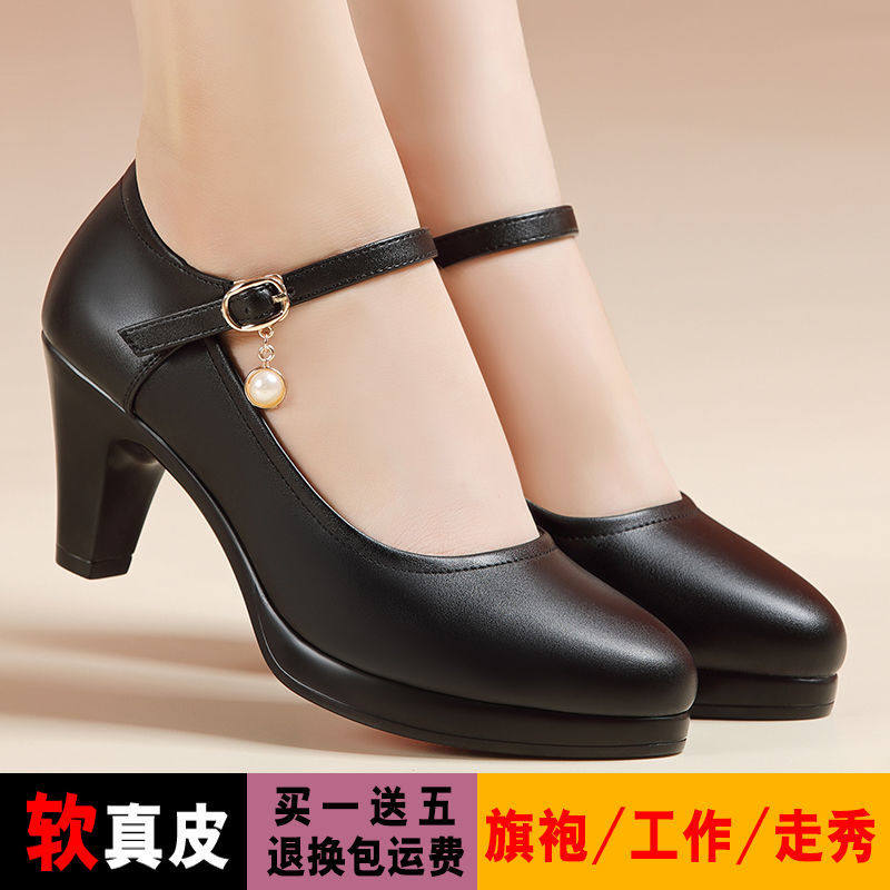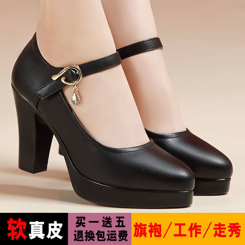 📚 真皮旗袍走秀高跟鞋模特T台防水台女粗跟单鞋中跟工作鞋中年皮鞋