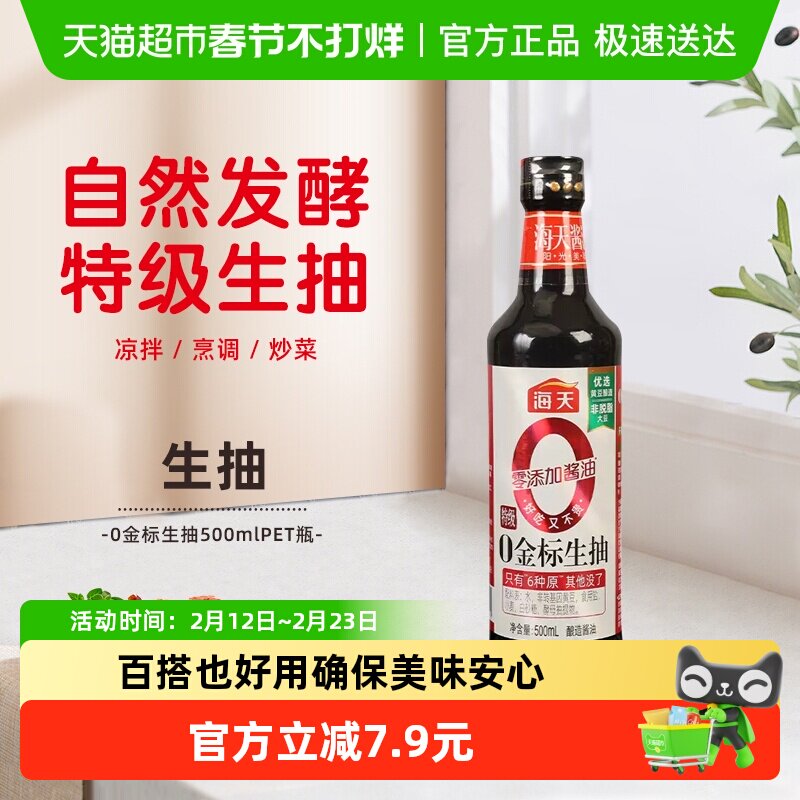 📚 海天酱油0金标特级金标生抽500mL炒菜凉拌健康厨房调味品塑料瓶