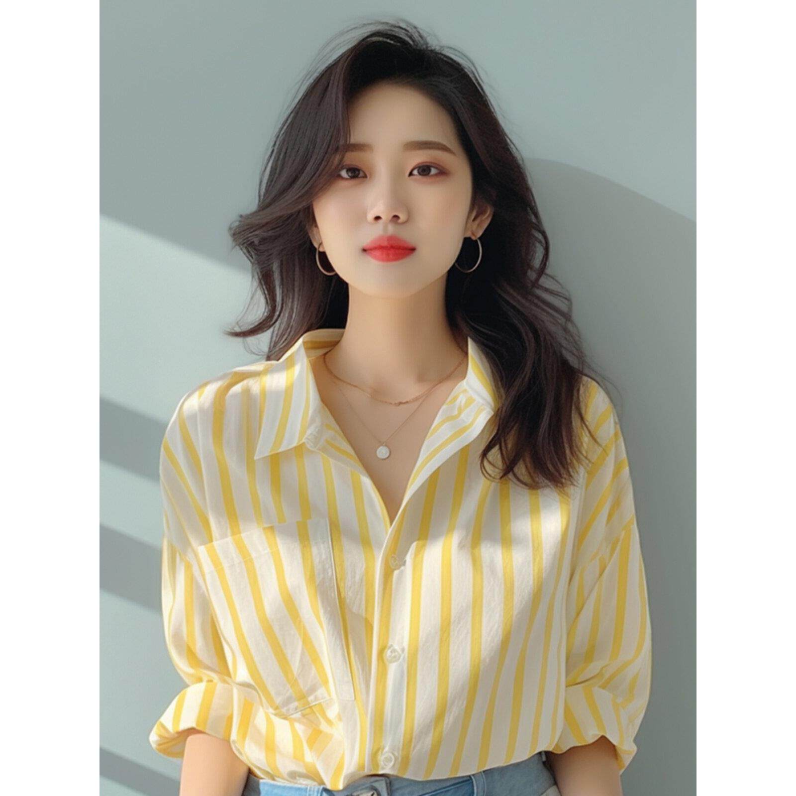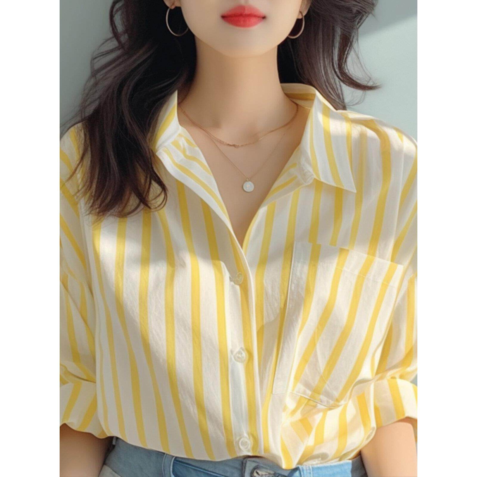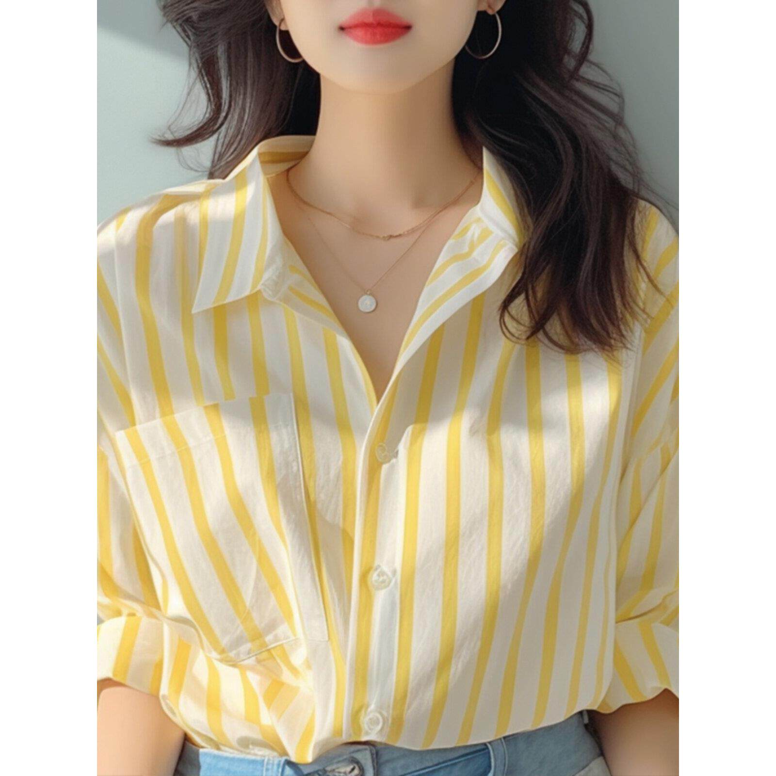📚 法国Rixo Rane 舒适高颜⭐黄白竖条纹衬衫女春秋季海边防晒衫衬衣